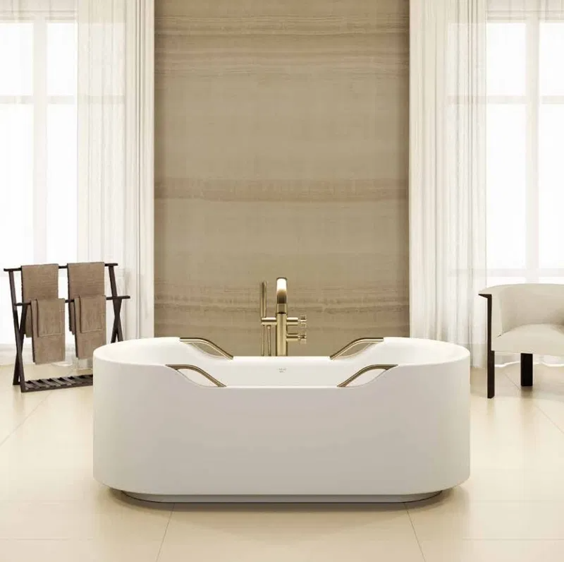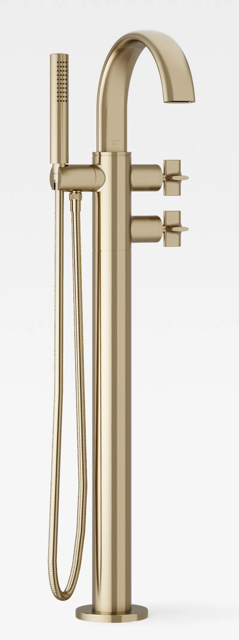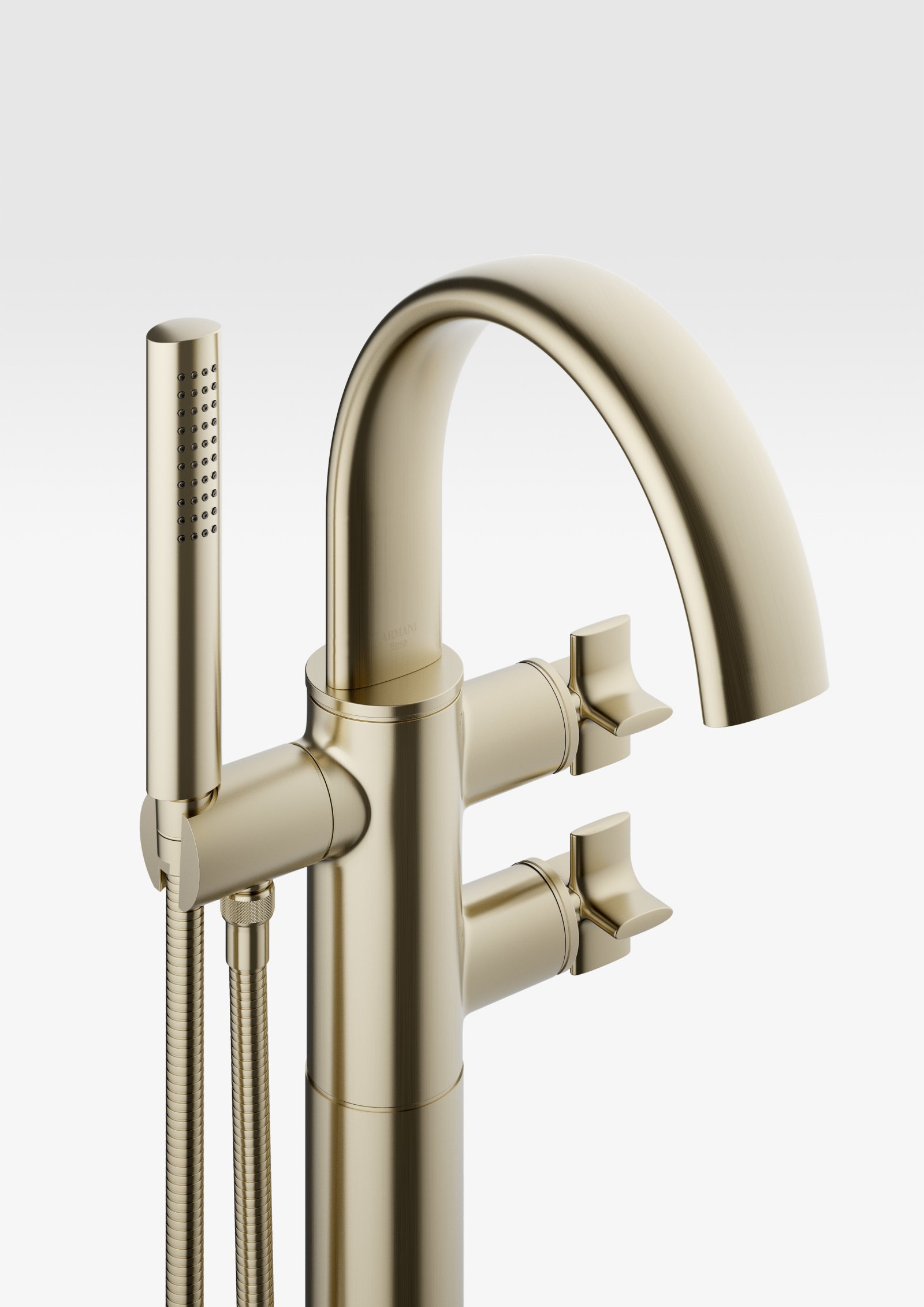 Bateria de cadă freestanding din colecția Armani_Baia reprezintă expresia supremă a luxului și a preciziei tehnologice, fiind concepută pentru a completa cele mai rafinate spații de baie. Dotată cu un cartuș termostatic performant, aceasta menține temperatura apei constantă, oferind o experiență de relaxare sigură și confortabilă. Finisajul exclusivist Greige, realizat prin tehnologia PVD, conferă suprafeței o textură sofisticată și o rezistență excepțională la uzură și coroziune. Designul impunător pentru montaj pe pardoseală integrează armonios funcția de cadă cu cea de duș, reflectând eleganța atemporală specifică parteneriatului dintre Giorgio Armani și Roca.