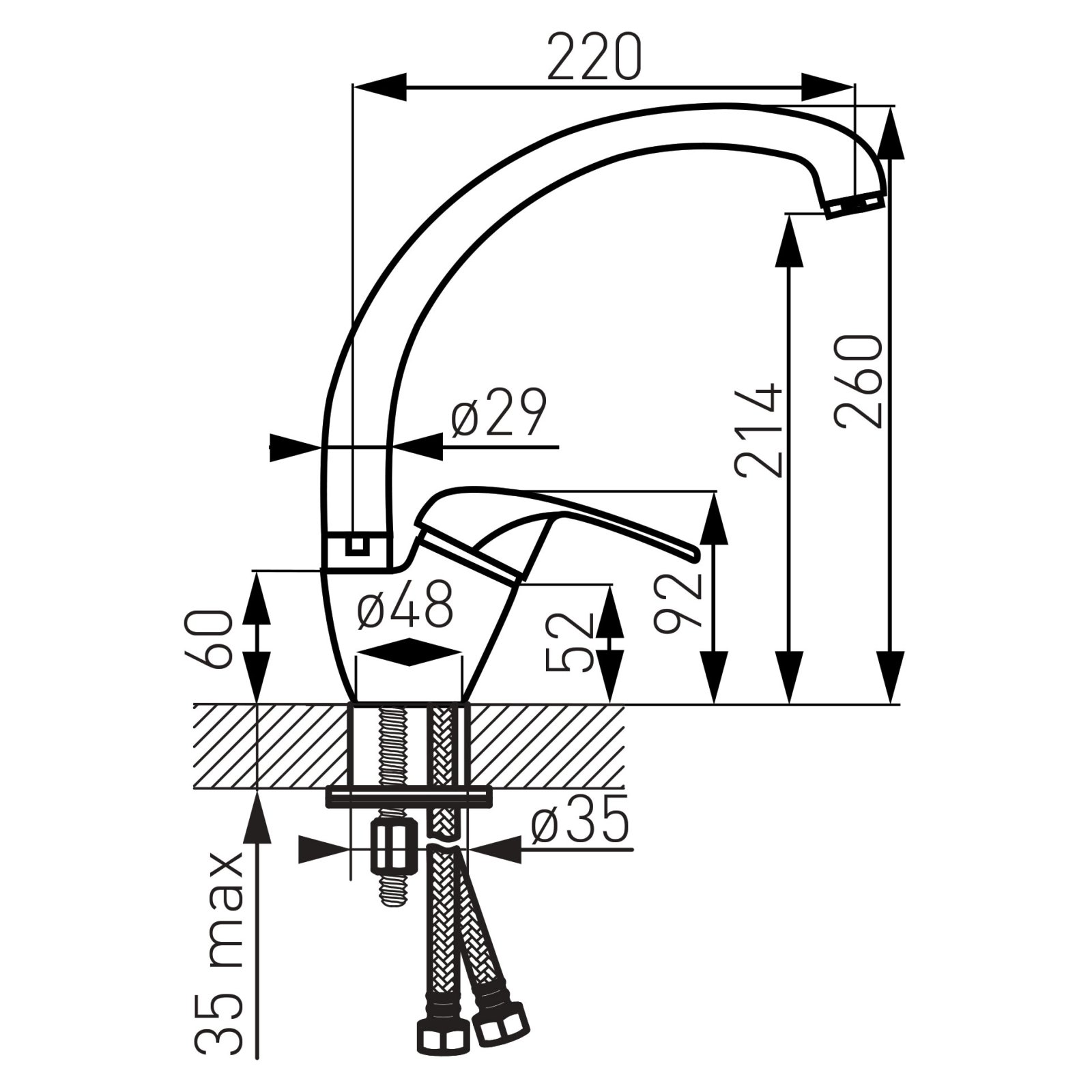 Compatibilitate și condiții de montare: proiectat pentru montaj pe chiuvetă sau blat; necesită un orificiu standard de 35 mm; setul include racorduri flexibile de alimentare G 3/8. Recomandări de îngrijire și siguranță: curățați cu o cârpă moale și produse neabrazive; evitați detergenții pe bază de acizi; după instalare verificați etanșeitatea conexiunilor sub presiune.