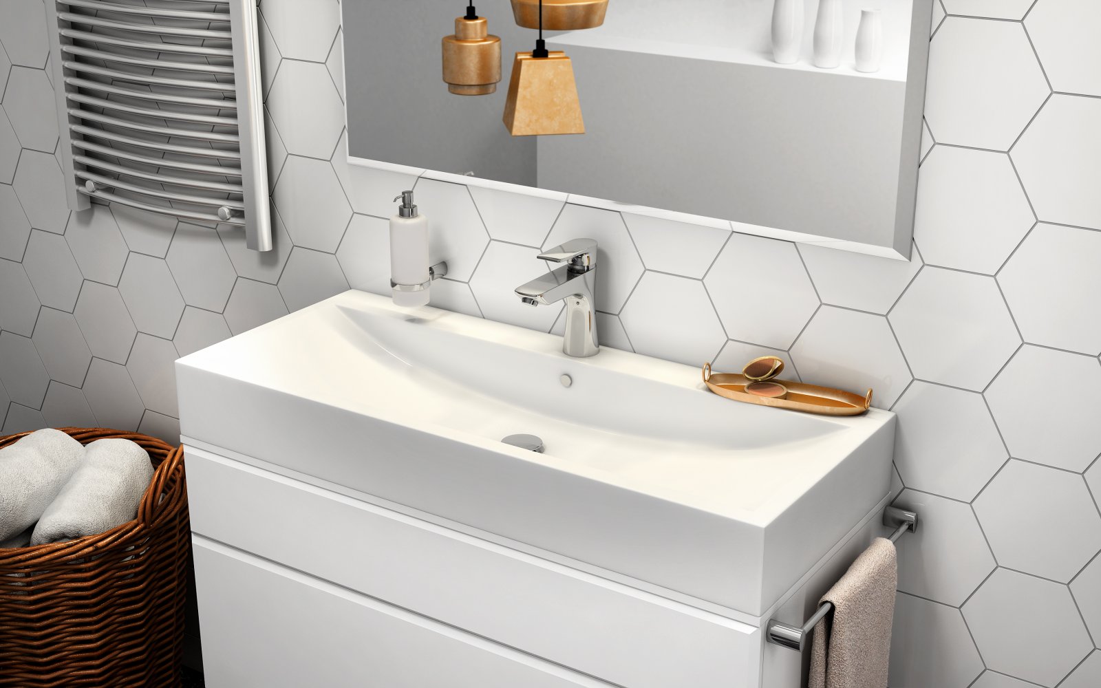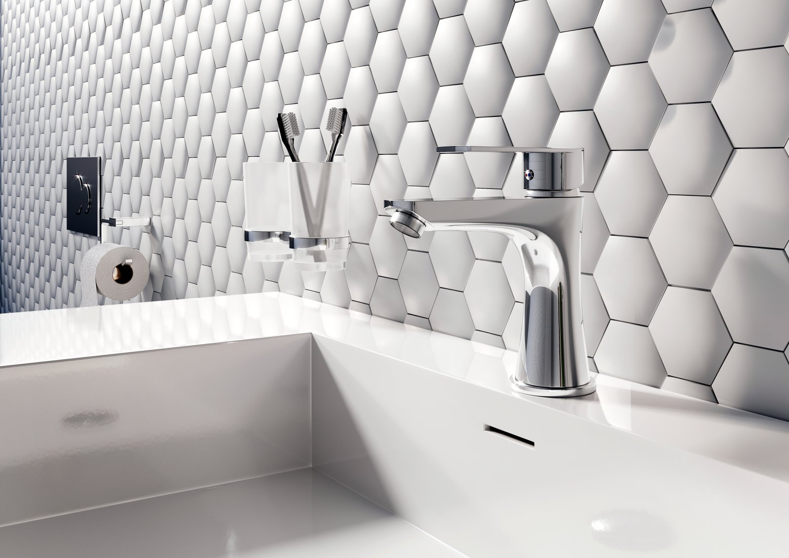 - design geometric modern din seria Algeo Square care adaugă un accent stilat băii