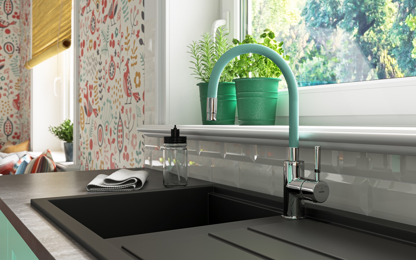 Bateria pentru bucătărie din colecția Zumba aduce un accent de prospețime și inovație în spațiul culinar prin pipa sa elastică în nuanța mentei. Designul flexibil permite ajustarea liberă a înălțimii jetului între 280-440 mm și a razei de acțiune între 150-350 mm, oferind o ergonomie superioară la spălarea vaselor voluminoase. Cartușul ceramic de 35 mm asigură o manevrare precisă și o funcționare silențioasă pe termen lung. Corpul din alamă cu finisaj cromat garantează o rezistență ridicată la coroziune, în timp ce pipa cu memorie de formă poate fi înlocuită ușor pentru a adapta estetica bucătăriei la noi preferințe cromatice.