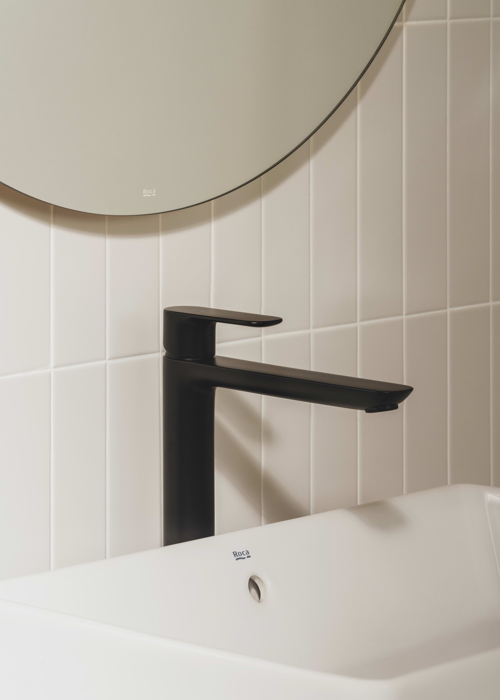 Bateria înaltă pentru lavoar din colecția Cala se distinge prin designul său minimalist și coloana zveltă, fiind o alegere ideală pentru lavoarele tip bol montate pe blat. Estetica modernă este susținută de tehnologia avansată Cold Start, care permite pornirea implicită pe apă rece, reducând consumul inutil de energie. Pipa lungă și înălțimea considerabilă oferă un confort sporit, permițând o utilizare liberă a spațiului de spălare. Finisajul negru mat, obținut prin procese galvanice avansate, conferă produsului o textură catifelată și o rezistență ridicată la coroziune și uzură.