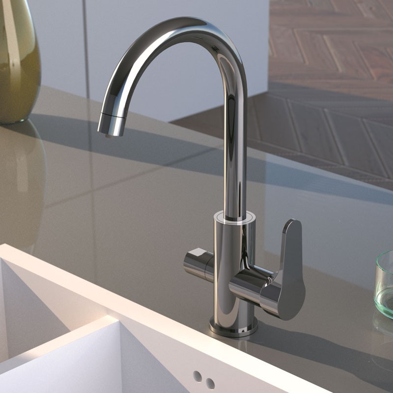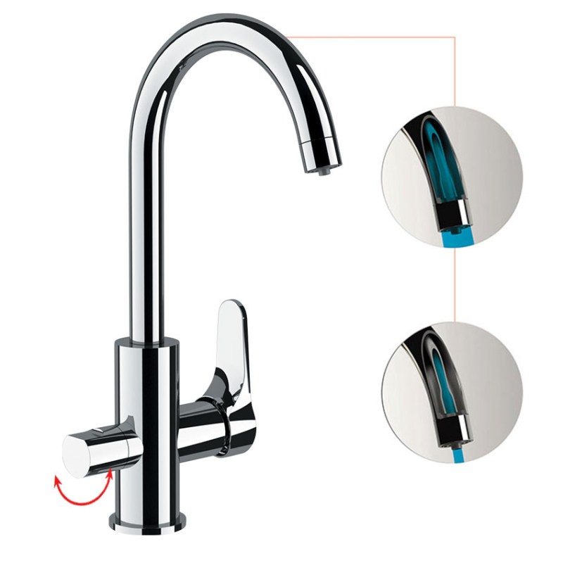 Bateria de bucătărie OMEGA 2 în 1 reprezintă o fuziune perfectă între designul clasic și funcționalitatea modernă, oferind acces la apa potabilă și cea de rețea dintr-un singur punct. Cu o înălțime de 360 mm, acest model oferă un spațiu de lucru generos, fiind ideal pentru spălarea vaselor de mari dimensiuni și umplerea recipientelor înalte. Corpul bateriei este echipat cu canale interne separate, astfel încât apa filtrată să nu intre niciodată în contact cu apa menajeră, păstrându-și puritatea. Finisajul cromat de înaltă calitate asigură o strălucire durabilă și o protecție eficientă împotriva coroziunii.