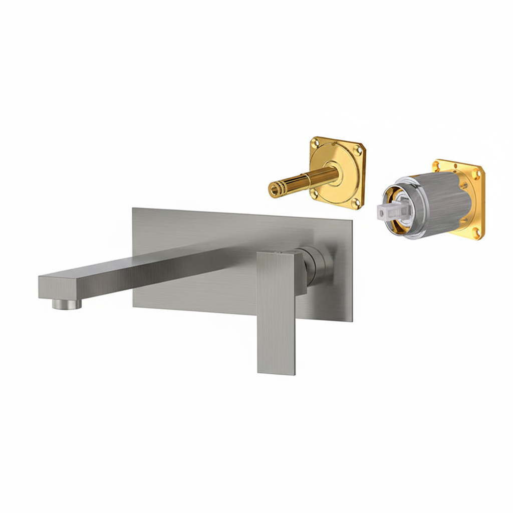 Bateria de lavoar încastrată din colecția Skyline se distinge printr-un design arhitectural modern, caracterizat de linii drepte și un profil minimalist. Finisajul "Visual Inox" oferă aspectul rafinat al oțelului inoxidabil periat, fiind o alegere ideală pentru băile contemporane ce pun accent pe texturi metalice calde și rezistență la amprente. Montajul ascuns pe perete eliberează complet zona lavoarului, creând o estetică aerisită și luxoasă. Pipa de 215 mm asigură un confort sporit în utilizare, fiind perfect adaptată pentru lavoarele de tip bol. Fabricată integral din alamă de înaltă calitate, această baterie din seria Skyline de la Daniel Rubinetterie îmbină precizia inginerească italiană cu un stil vizual de impact.
