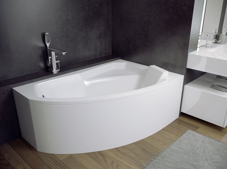 Cada asimetrică din acril Besco RIMA 140x90 cm este destinată montajului în colț, versiunea dreapta, fiind echipată cu suporturi W.
