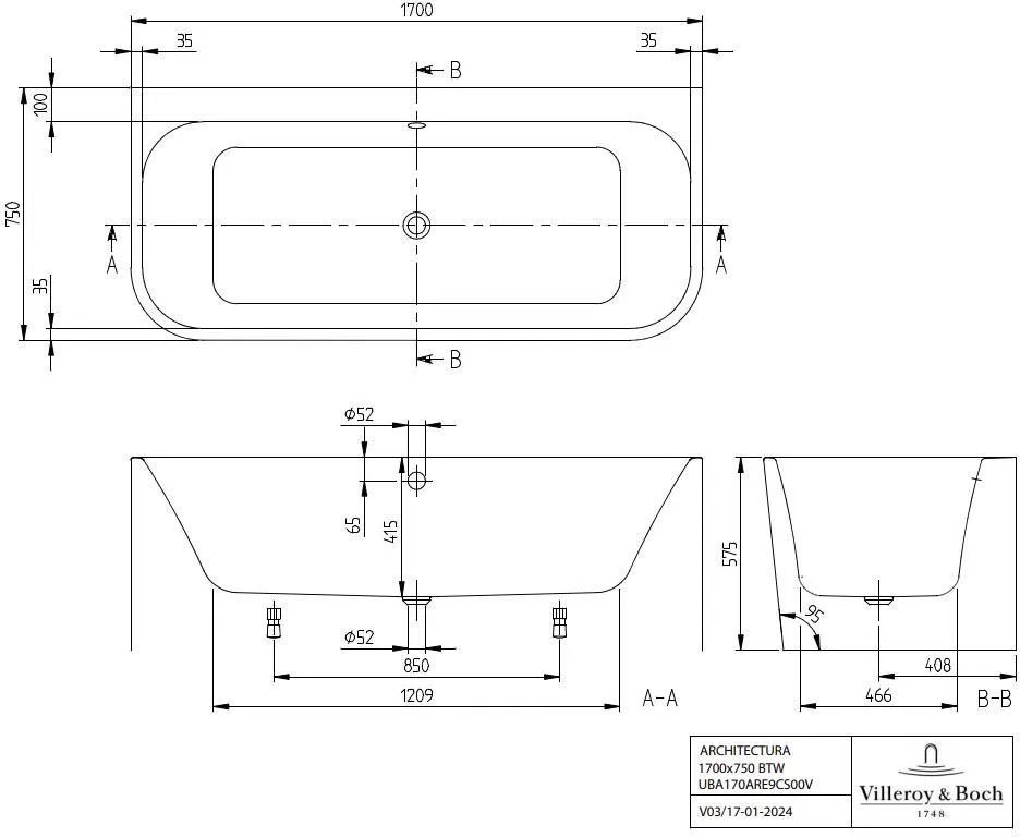 Cada din acril sanitar Villeroy & Boch Architectura 170x75 cm este destinată montării lipite de perete.