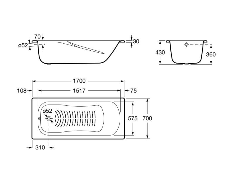 Lungimea căzii 170 cm, lățimea 70 cm, adâncimea 43 cm; concepută pentru o persoană.