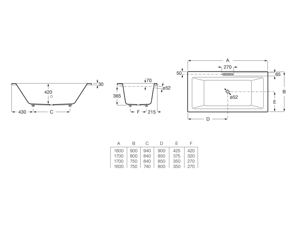 Lungimea este de 170 cm, lățimea 80 cm, adâncimea aproximativ 43 cm; oferă confort la baie și rezistență la variații de temperatură. Forma simetrică cu linii fine asigură un aspect elegant; se livrează cu picioare reglabilе; panourile frontale și laterale se achiziționează separat.