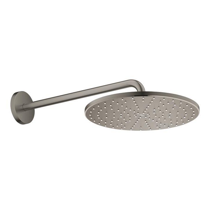Capul de duș superior Grohe Rainshower Mono, brushed hard graphite este o unitate de duș rotundă cu diametrul de 310 mm și un singur tip de jet PureRain, care oferă un flux de apă uniform și delicat, similar cu ploaia naturală. Setul include un braț de perete de 422 mm pentru o instalare stabilă. Tehnologiile integrate Grohe DreamSpray asigură o distribuție optimă a apei prin toate orificiile, iar sistemul EcoJoy reduce consumul de apă la aproximativ 7,5 l/min fără a compromite performanța dușului. Finisajul LongLife și duzele SpeedClean facilitează întreținerea și protejează împotriva depunerilor de calcar și zgârieturilor.