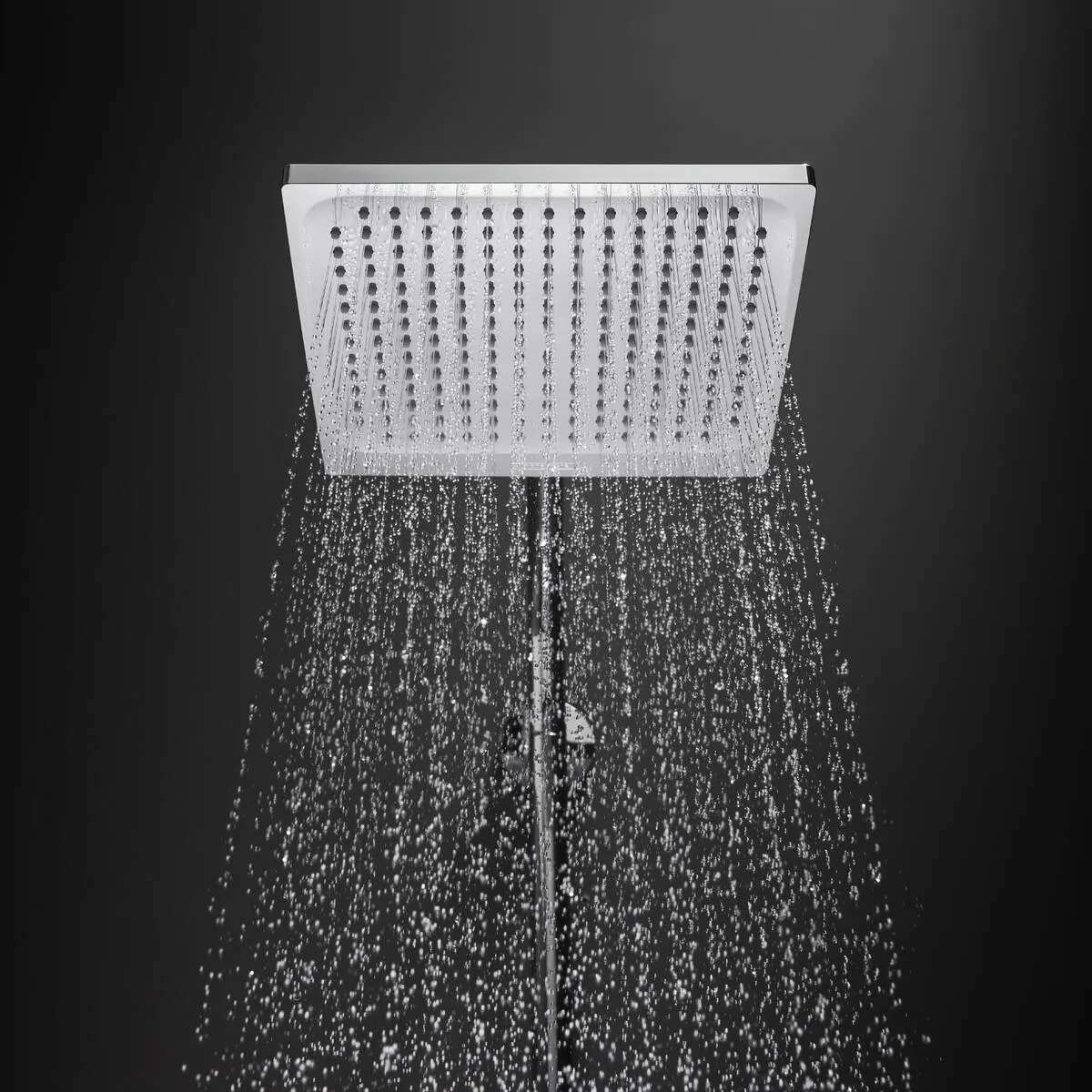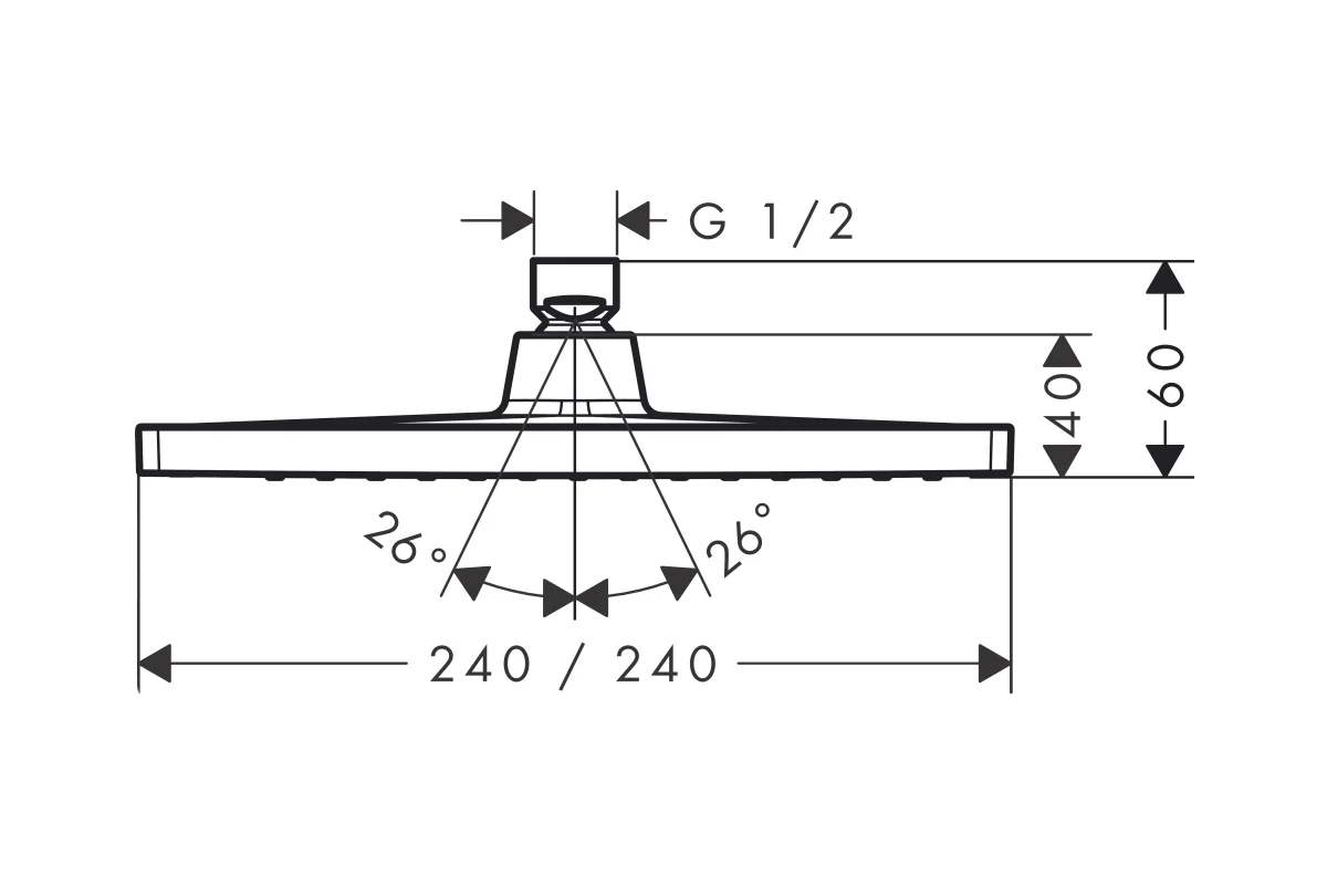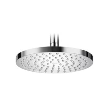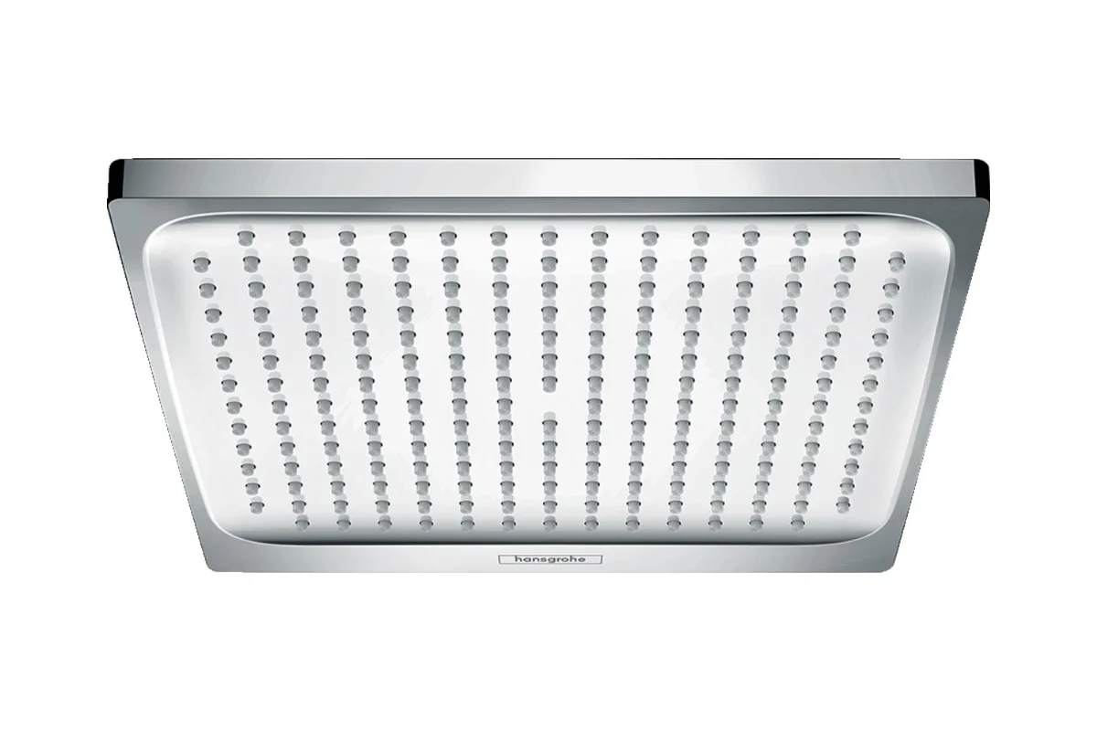 Cap de duş de plafon sau perete, conceput sub forma unei pălării pătrate cu dimensiunea 240 x 240 mm şi racord filetat G 1/2 (DN15). Discul pulverizator este realizat din plastic, iar corpul este metalic / din alamă, oferind durabilitate şi stabilitate. Jetul „Rain” asigură o ploaie uniformă care îmbracă întregul corp — datorită dimensiunii mari a capului de duş. Tehnologia QuickClean permite curăţarea rapidă a duzelor din silicon doar prin frecare cu degetul, fără utilizarea de soluţii abrazive. Capul de duş este montabil pe tavan sau pe perete, cu posibilitatea de reglare a unghiului prin articulaţia cu bilă.