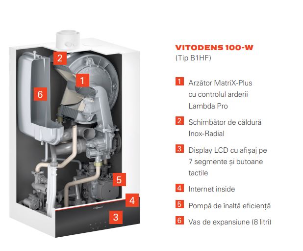 Cazanul mural în condensare Viessmann Vitodens 100-W B1HF 25 kW este destinat încălzirii spațiilor de până la 250 m². Este un cazan cu un singur circuit, cu evacuare forțată a gazelor arse, compatibil cu un boiler extern pentru apă caldă menajeră. Automatizarea digitală cu interfață WLAN permite controlul prin aplicația ViCare, iar display-ul tactil facilitează reglajul și monitorizarea.