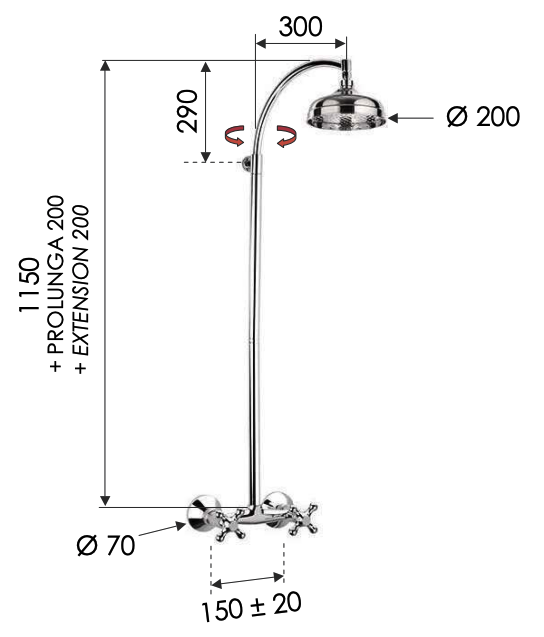 Set de duș cu coloană rotativă și cap de duș superior, realizat integral din alamă cromată. Conceput pentru utilizare în cabine de duș și băi, asigură un debit stabil de apă și o durată lungă de viață.