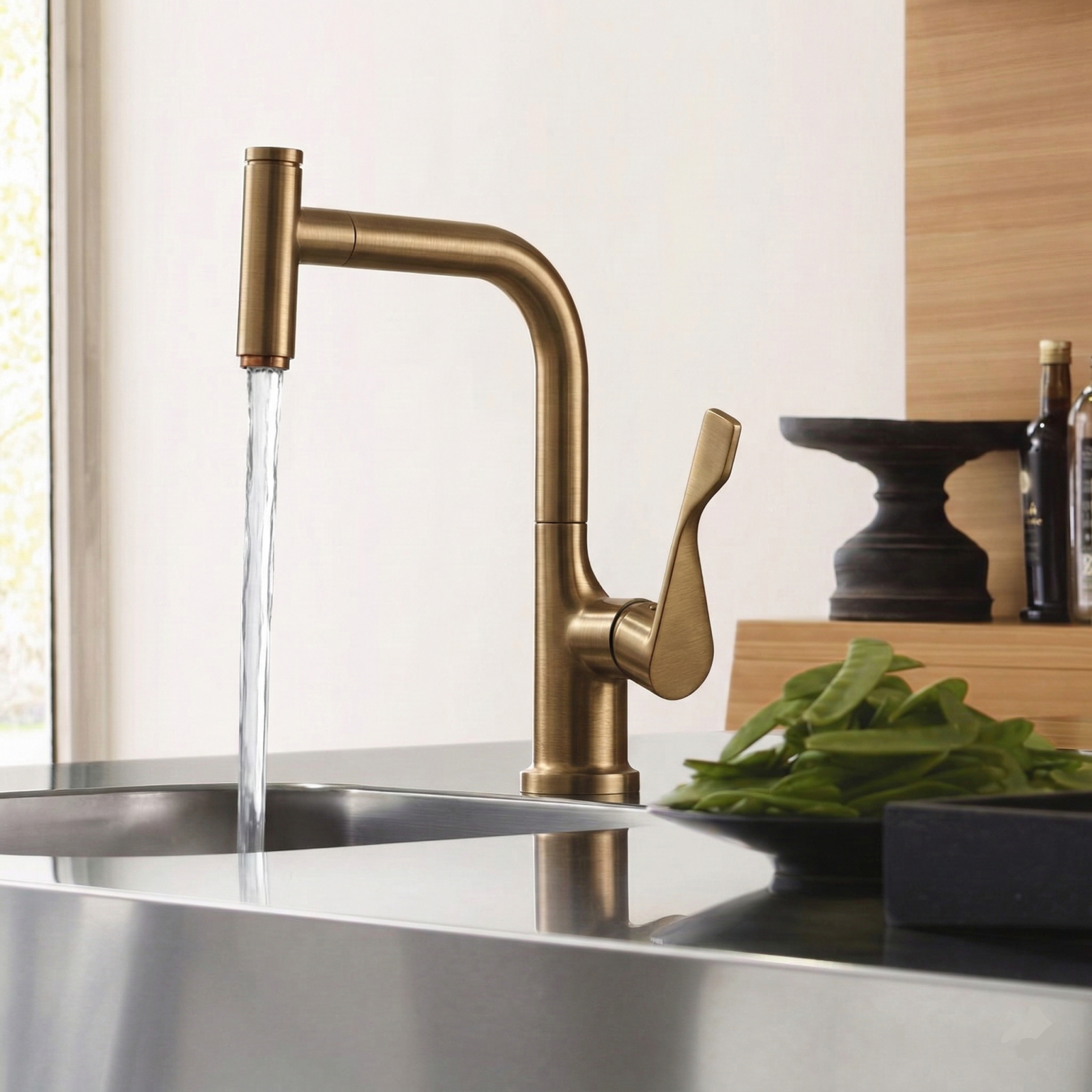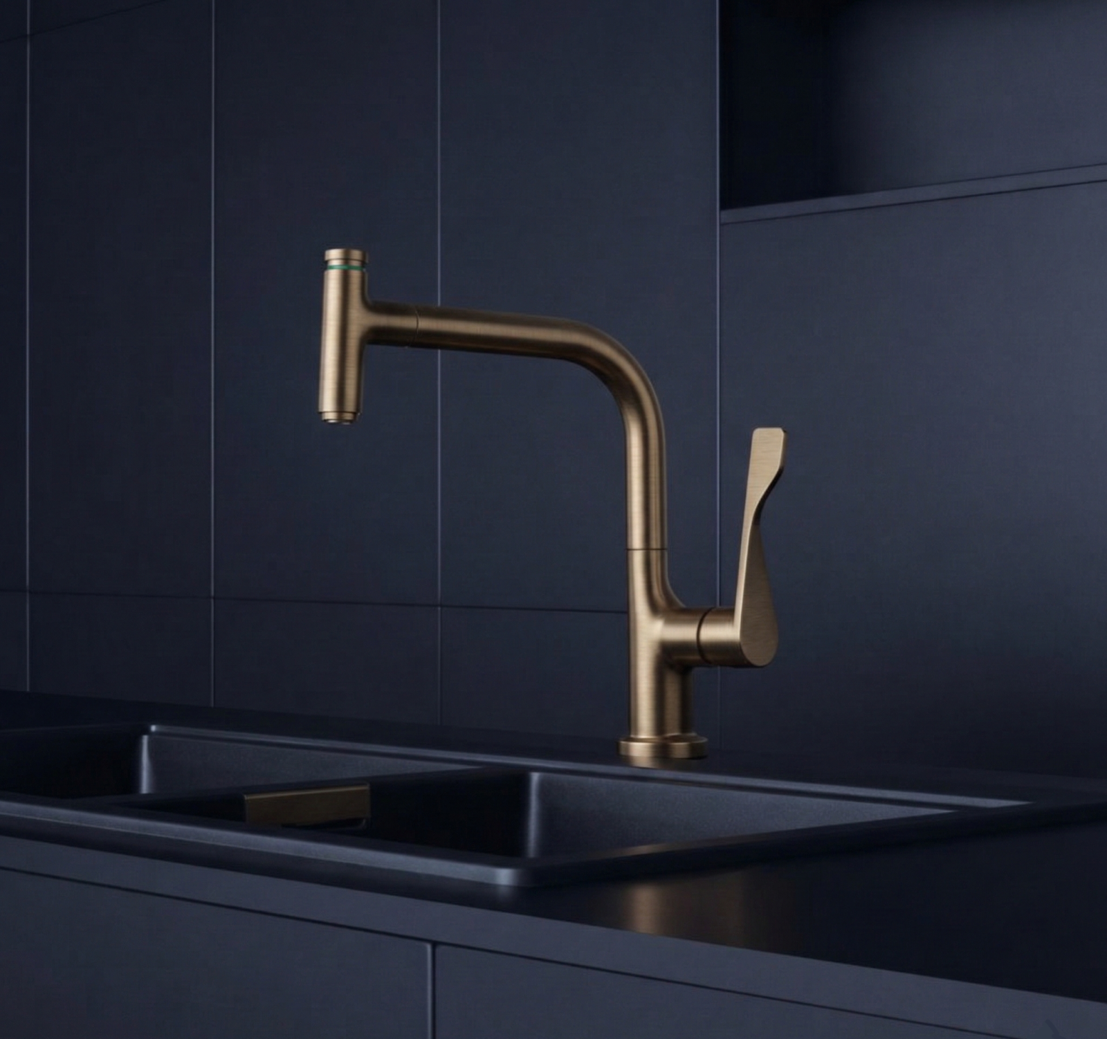 Bateria de bucătărie Axor din colecția Citterio reprezintă un etalon al rafinamentului și ingineriei de precizie, oferind o estetică sculpturală prin finisajul Brushed Bronze. Pipa înaltă, cu o siluetă elegantă, este dotată cu un duș extractibil ce extinde considerabil raza de acțiune, facilitând curățarea eficientă a întregii zone a chiuvetei. Tehnologia MagFit asigură fixarea magnetică silențioasă și sigură a dușului în suport după utilizare. Suprafața periată, realizată prin tehnologia PVD, oferă o rezistență excepțională la zgârieturi și amprente, păstrând aspectul luxos al produsului în condiții de exploatare intensă.