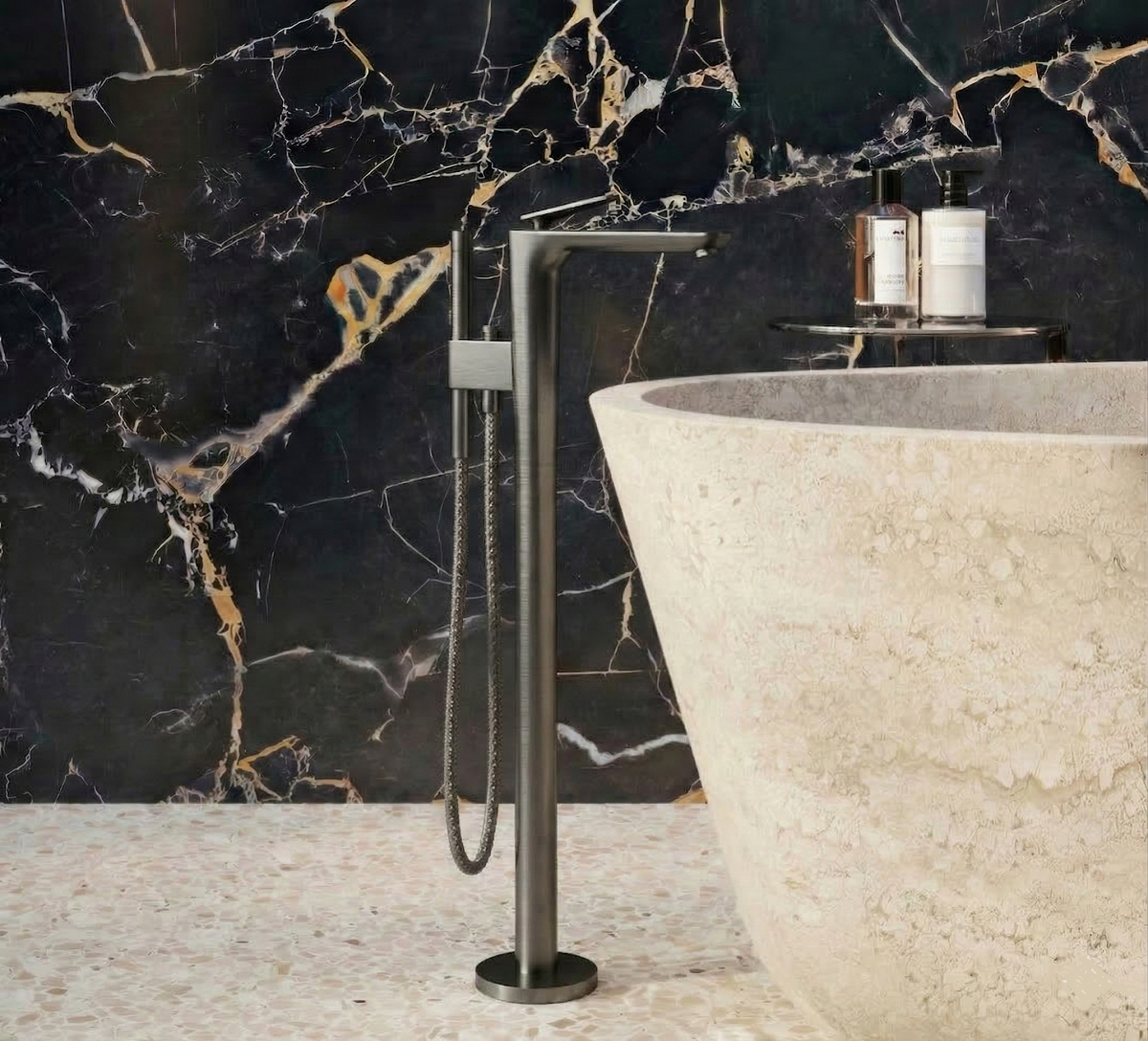 Bateria de cadă freestanding din colecția Axor Citterio C reprezintă o fuziune impecabilă între eleganța clasică și rigoarea modernă, purtând semnătura celebrului designer Antonio Citterio. Liniile curbate și suprafețele atent finisate fac din acest model o piesă sculpturală lângă căzile de tip insulă. Finisajul Brushed Black Chrome, realizat prin tehnologia avansată PVD, oferă o textură metalică sofisticată și o rezistență excepțională la zgârieturi. Mânerul ergonomic permite un control fluid al debitului și temperaturii, în timp ce divertorul integrat asigură trecerea ușoară către para de duș manuală, oferind o experiență de utilizare premium.
