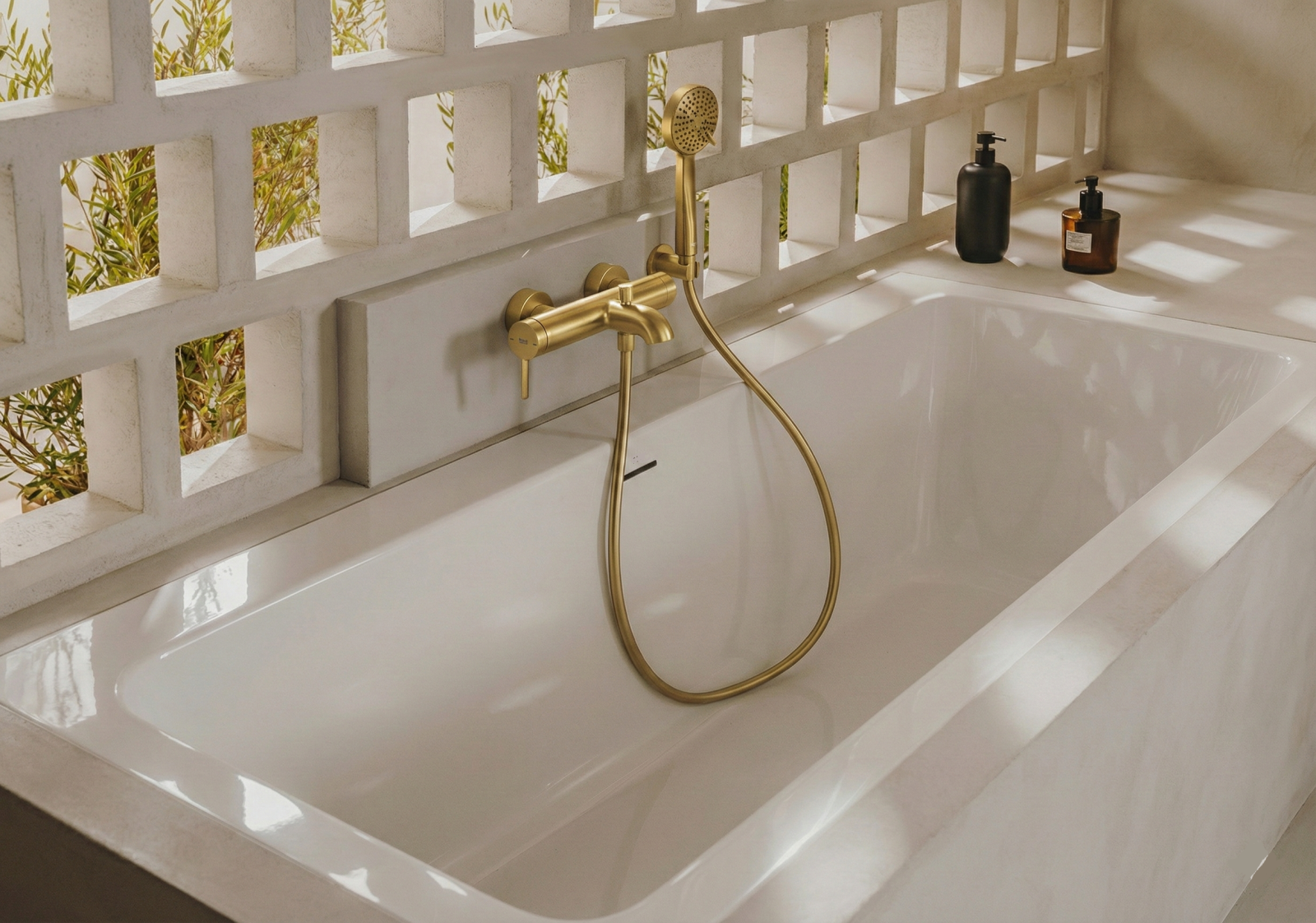 Bateria monocomandă pentru cadă din colecția Ona reflectă o estetică inspirată de formele organice ale naturii, aducând un plus de eleganță prin finisajul aur periat. Tehnologia de acoperire Everlux asigură o suprafață extrem de rezistentă la zgârieturi și își menține strălucirea pe parcursul anilor. Designul subțire și cilindric al corpului bateriei, combinat cu o pârghie ergonomică, permite o operare intuitivă și precisă. Această soluție este ideală pentru interioarele contemporane care caută un echilibru între luxul discret și fiabilitatea tehnică de înaltă calitate.
