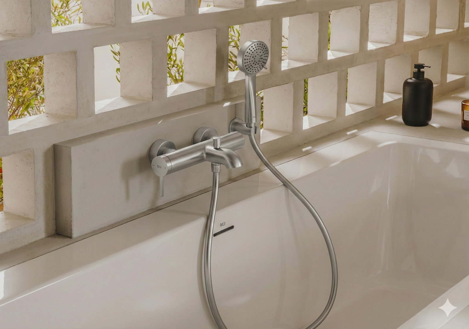 Bateria monocomandă pentru cadă din colecția Ona se distinge printr-o estetică modernă și echilibrată, inspirată de formele naturale. Finisajul Inox, realizat prin tehnologia avansată Everlux, oferă o suprafață mată rafinată, extrem de rezistentă la zgârieturi și amprente. Designul cilindric subțire al corpului bateriei este completat de o pârghie ergonomică ce permite controlul precis al temperaturii și debitului de apă. Această soluție tehnică îmbină durabilitatea materialelor de înaltă calitate cu un aspect vizual minimalist, fiind ideală pentru băile contemporane care pun accent pe simplitate și eleganță discretă.