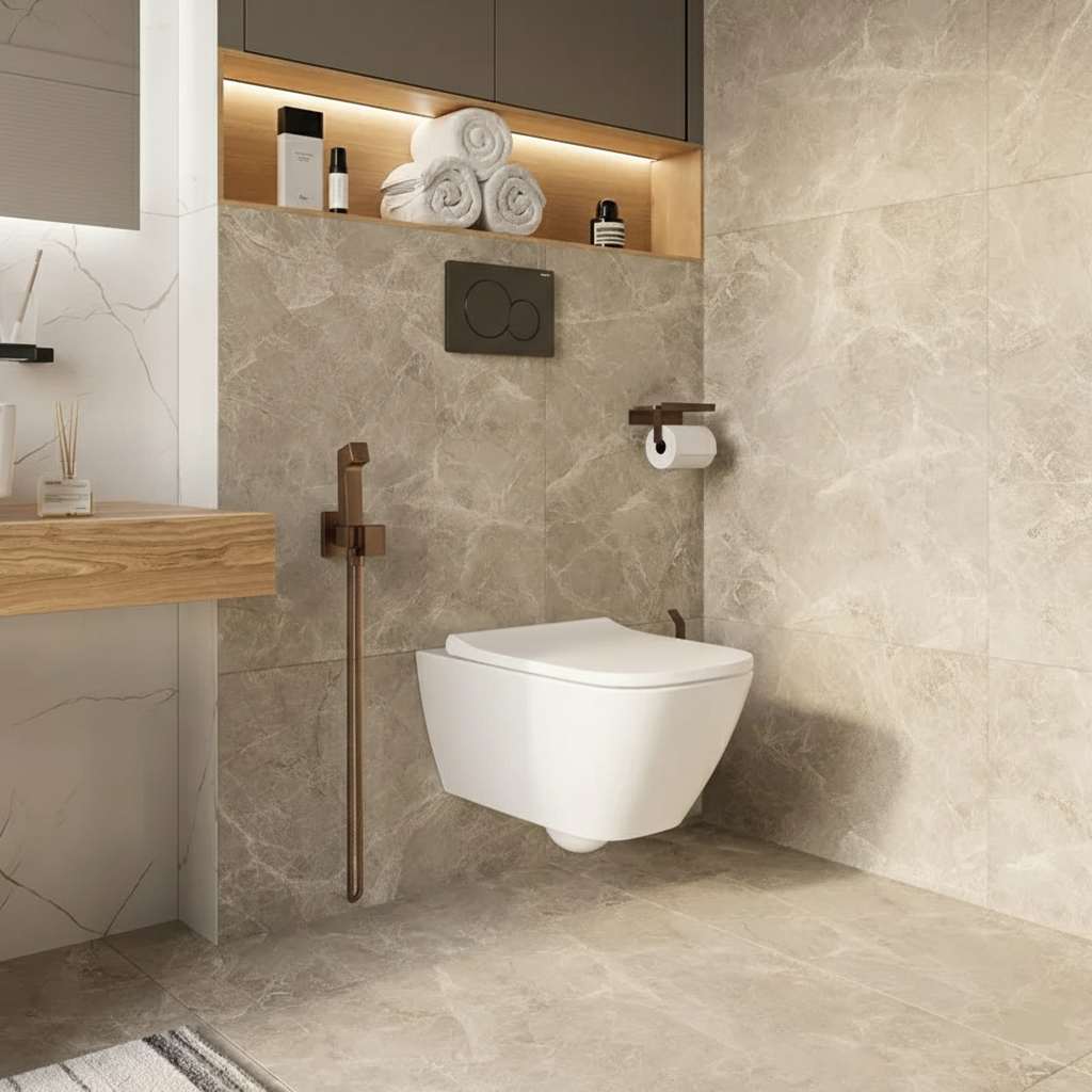 Bateria de duș igienic din seria Bidette Square de la Hansgrohe este concepută pentru a oferi o soluție practică și durabilă pentru igiena personală, remarcându-se prin formele sale geometrice precise și finisajul exclusivist Brushed Bronze. Setul include o pară de duș ergonomică cu buton de activare și un furtun flexibil cu lungimea de 125 cm, care asigură o libertate de mișcare optimă. Nuanța bronz periat conferă produsului un aspect vizual cald și o rezistență ridicată în utilizarea zilnică, fiind ideal pentru băile moderne cu accente metalice. Suportul integrat asigură o fixare stabilă și accesibilă a perei de duș după utilizare, oferind o funcționalitate discretă.