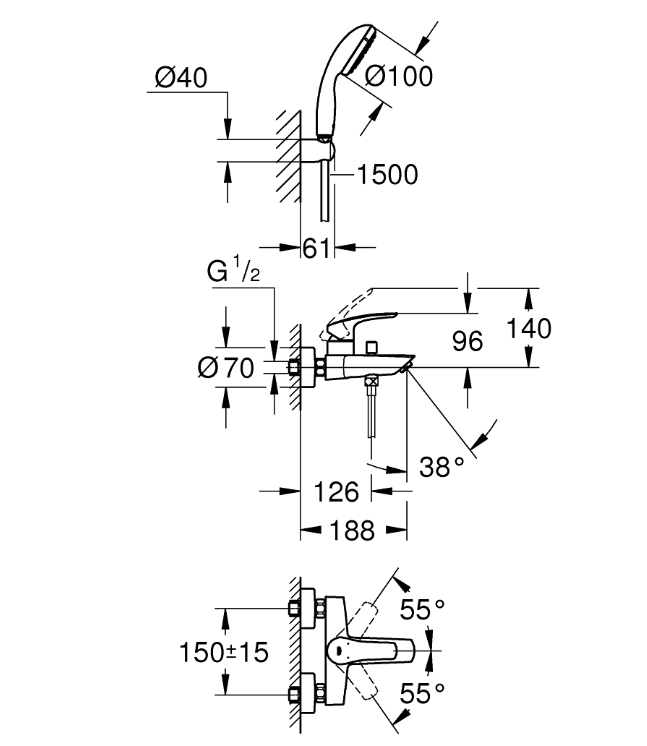 Compatibilitate și condiții de montare: proiectat pentru montaj pe perete; distanța între axe 150-15 mm; conexiune standard G 1/2. Recomandări de îngrijire și siguranță: curățați cu apă și săpun neutru; clătiți bine și ștergeți cu o cârpă moale; verificați integritatea furtunului de duș periodic.