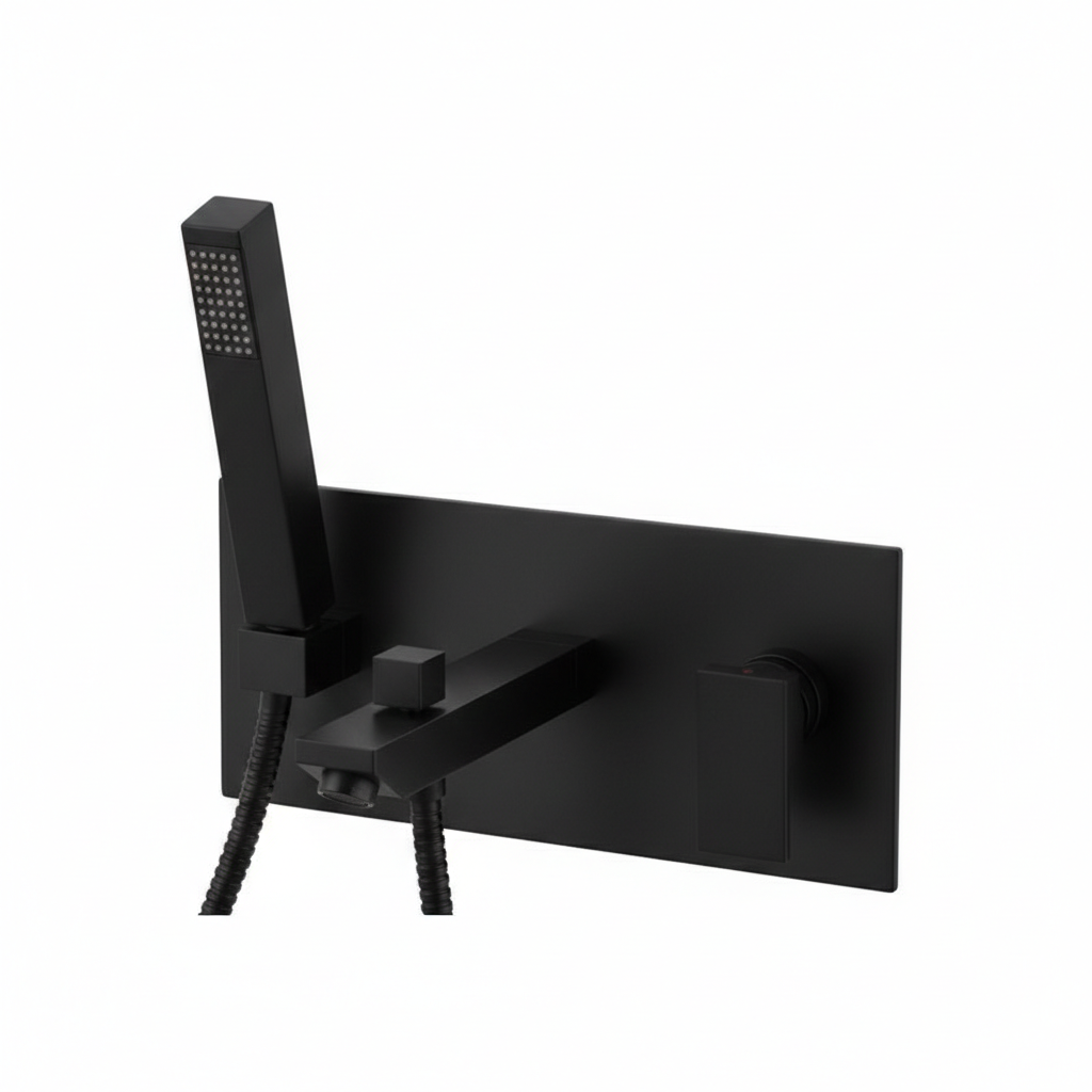 Bateria de cadă și duș încastrată din colecția Skyline, în finisaj negru mat, se impune prin linii geometrice riguroase și o estetică arhitecturală modernă. Sistemul monocomandă dotat cu un cartuș ceramic de înaltă precizie asigură o reglare lină a temperaturii și a debitului de apă, oferind un control deplin și confortabil. Montajul ascuns pe perete eliberează spațiul vizual, lăsând la vedere doar elementele de comandă și placa rectangulară elegantă, care maschează mecanismul interior. Suprafața mată este extrem de rezistentă la amprente și coroziune, menținându-și aspectul impecabil în timp, în timp ce divertorul integrat permite comutarea rapidă între ieșirile de apă.