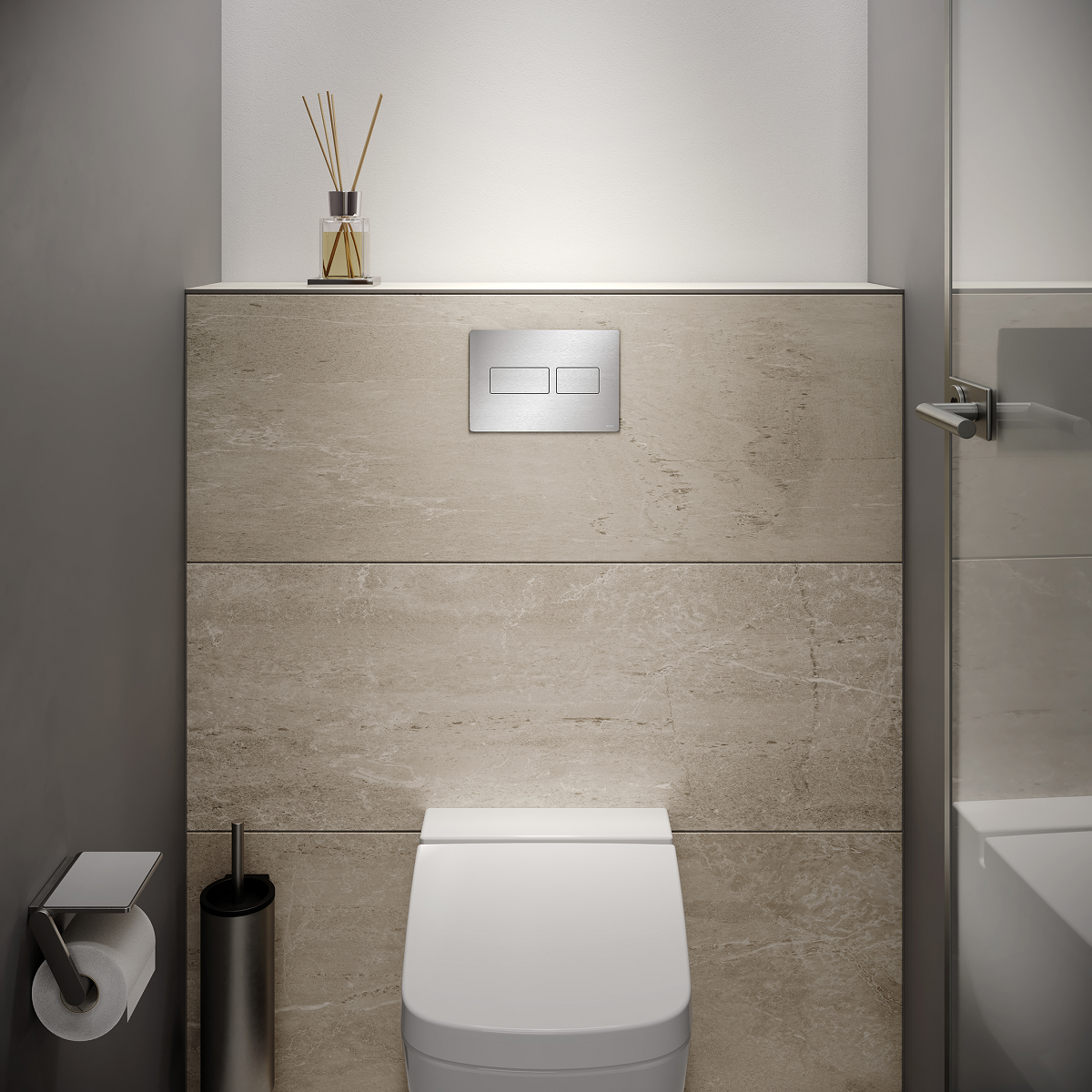 Clapeta de acționare TECEsolid din oțel inoxidabil mat este definită prin robustețe și o estetică industrială rafinată, fiind ideală pentru spațiile cu cerințe ridicate de igienă și durabilitate. Suprafața este tratată cu un strat special anti-amprentă, care previne apariția urmelor vizibile și facilitează curățarea rapidă, menținând aspectul impecabil al metalului. Sistemul cu dublă acționare oferă utilizatorului control deplin asupra consumului de apă, permițând selectarea volumului de spălare optim. Construcția extra-plat de doar 6 mm grosime asigură o integrare discretă pe suprafața peretelui, combinând rezistența structurală a inoxului cu un design minimalist.