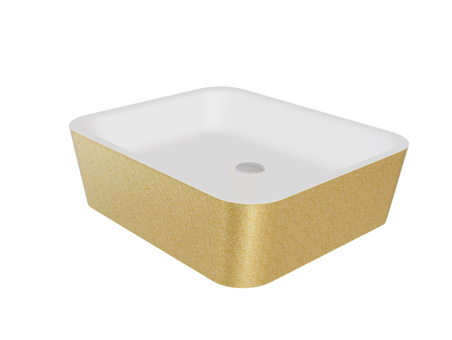 Lavoarul Besco ASSOS Glam este conceput pentru montare pe blat în băi moderne, oferind un element estetic și funcțional pentru zona de spălare. Forma dreptunghiulară cu dimensiunile 500x400x150 mm se integrează ușor pe mobilier sau blat, iar nuanța aurie adaugă un accent vizual distinct. Produsul este fabricat din compozit mineral Mineral DuraBe cu o suprafață netedă Gelcoat, rezistentă la pete și ușor de întreținut.