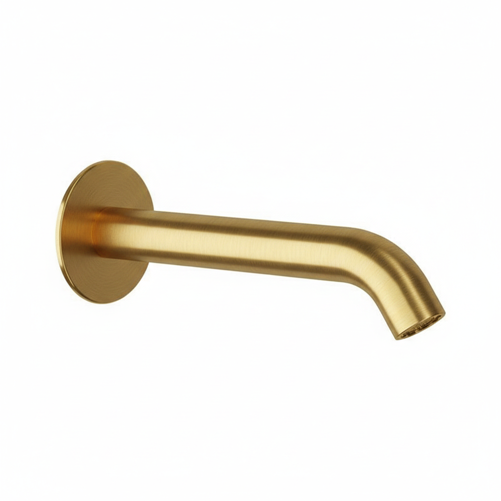 Pipa de cadă montată pe perete din colecția Tokyo reprezintă o piesă de accent sofisticată, definită prin linii geometrice riguroase și un design minimalist contemporan. Aceasta este proiectată pentru a completa sistemele de baie moderne, oferind o soluție estetică pentru umplerea precisă a căzii. Finisajul auriu șlefuit (Brushed Gold) conferă produsului o prezență luxuriantă și o textură rafinată, fiind realizat pentru a rezista la coroziune și a minimiza vizibilitatea amprentelor. Construcția sa robustă din alamă asigură o funcționare fiabilă, în timp ce aeratorul integrat garantează un jet de apă uniform și silențios.
