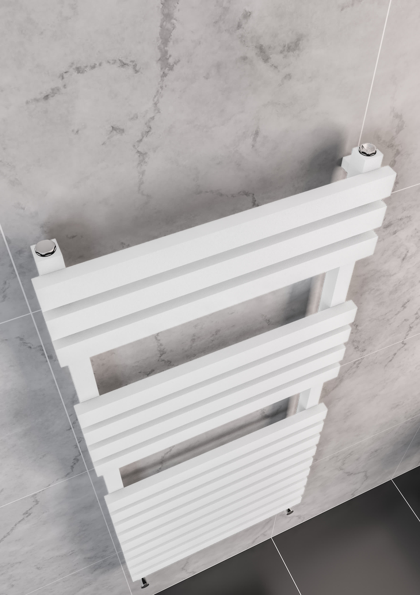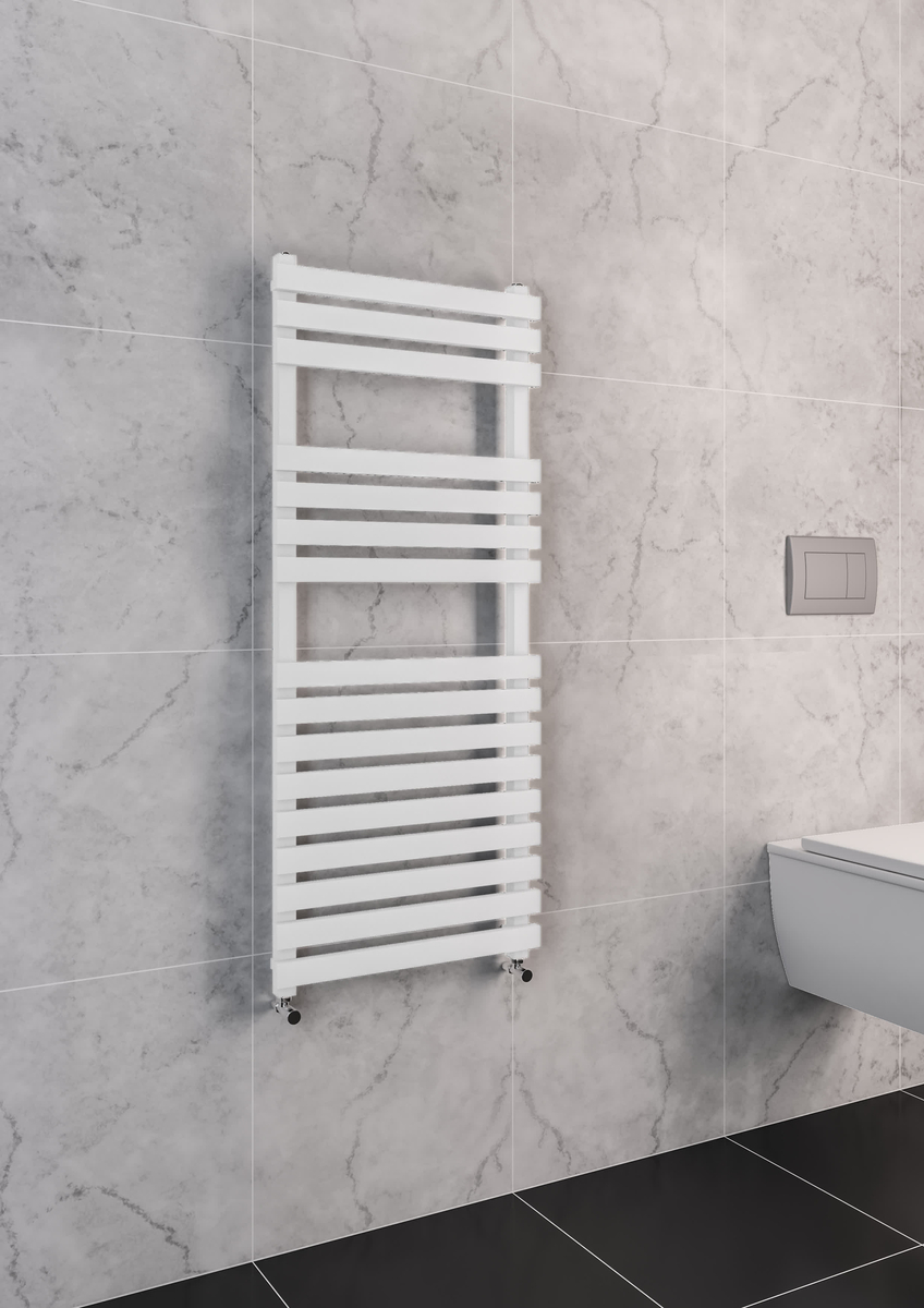 Radiator de baie din oțel, dimensiuni 500x1200 mm, finisaj alb mat. Se montează pe perete și oferă o încălzire eficientă a băii, fiind suficient de înalt pentru a distribui căldura pe verticală și a ajuta la uscarea prosoapelor. Modelul funcționează pe apă (agent termic) și poate fi echipat ulterior cu un TEN electric compatibil pentru a obține un model combinat (apă + electric).