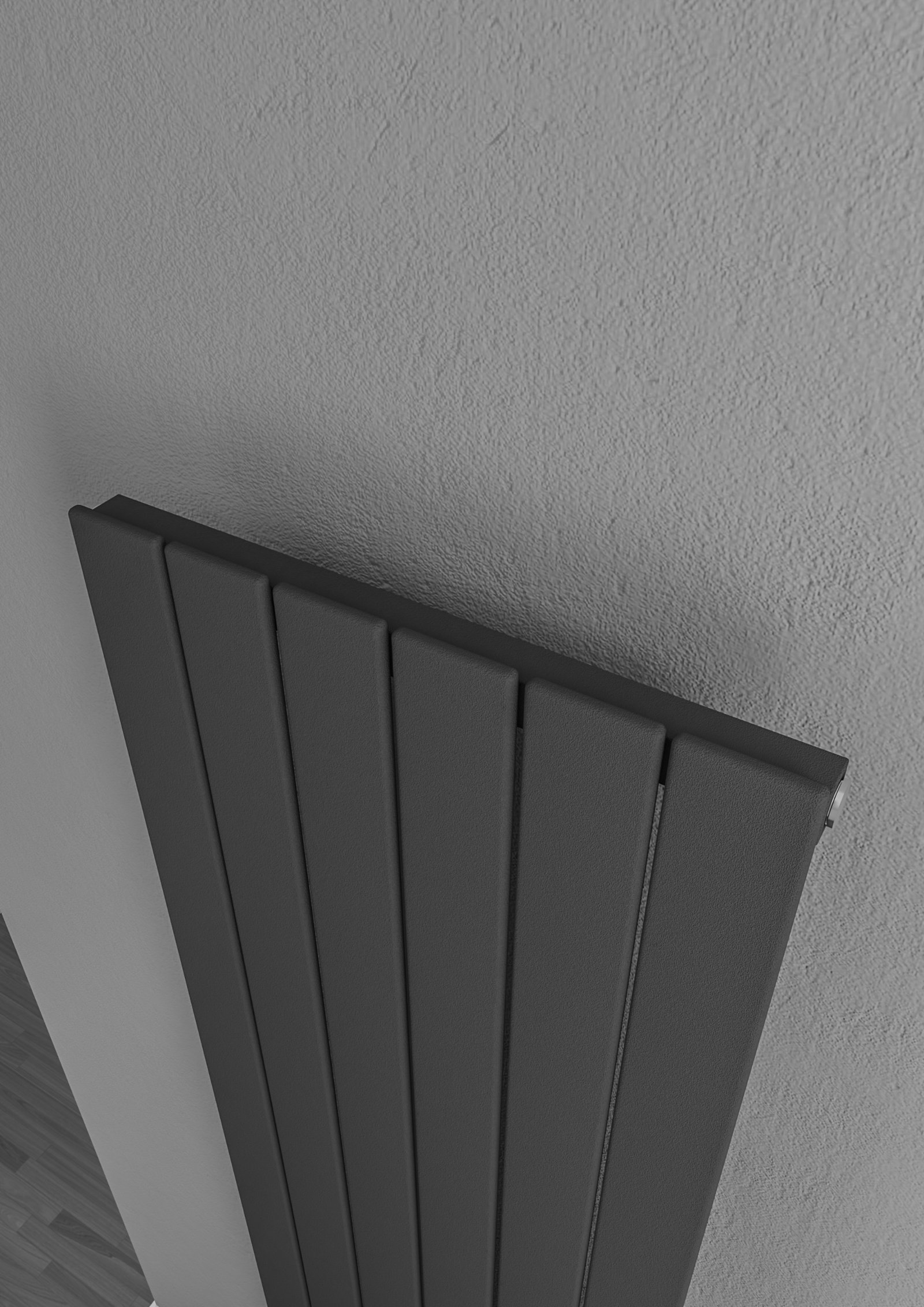 Radiator de baie din oțel, dimensiuni 445x1800mm, finisaj negru. Se montează pe perete și oferă o încălzire eficientă a băii, fiind suficient de înalt pentru a distribui căldura pe verticală și a ajuta la uscarea prosoapelor. Modelul funcționează pe apă (agent termic) și poate fi echipat ulterior cu un TEN electric compatibil pentru a obține un model combinat (apă + electric).