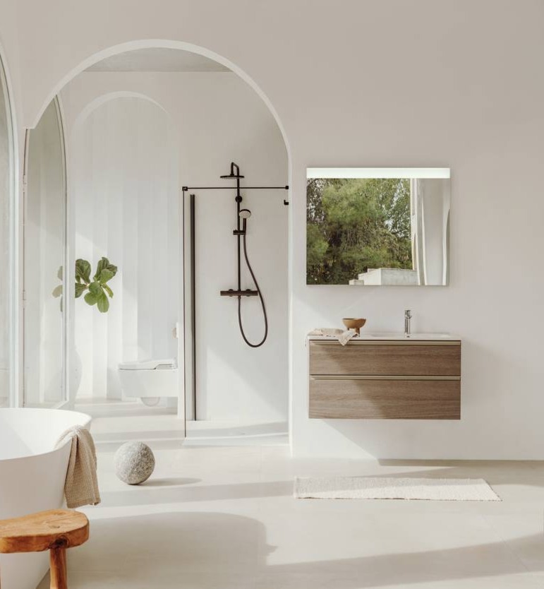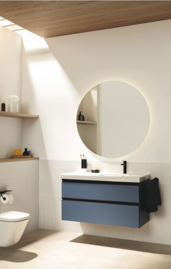 Compatibilitate și condiții de montaj: instalare suspendată pe perete cu setul de fixare inclus; compatibil cu mobilier pentru lavoar de 1000x460 mm și baterii pentru un singur orificiu; recomandată utilizarea ventilului click-clack 1 1/4" cu preaplin și a sifonului tip sticlă, achiziționate separat.