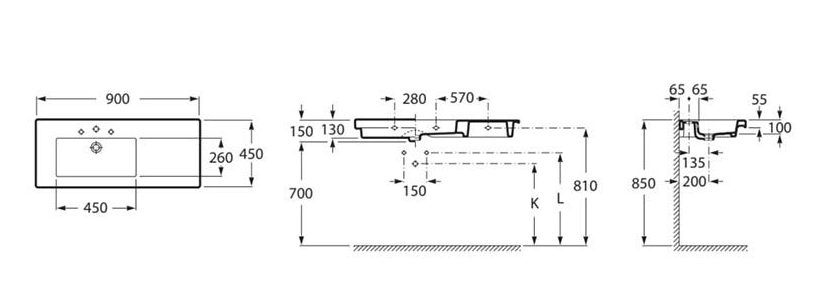 Lavoar pe blat PRISMA 90 x 45, asimetric, stinga