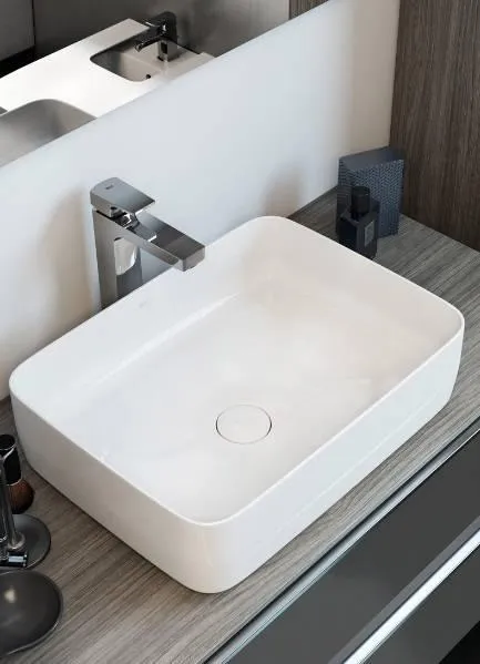 Lavoarul INSPIRA SQUARE pentru montaj pe blat este conceput pentru băi moderne, oferind o soluție funcțională și echilibrată vizual pentru zona de spălare. Forma pătrată și dimensiunile 500x370x140 mm permit amplasarea armonioasă pe mobilier sau blat decorativ, asigurând integrarea în designul interior. Materialul FINECERAMIC® se remarcă prin pereți subțiri și rezistenți, precizie ridicată de fabricație și greutate redusă, ceea ce facilitează montajul și utilizarea, iar suprafața netedă simplifică întreținerea periodică.