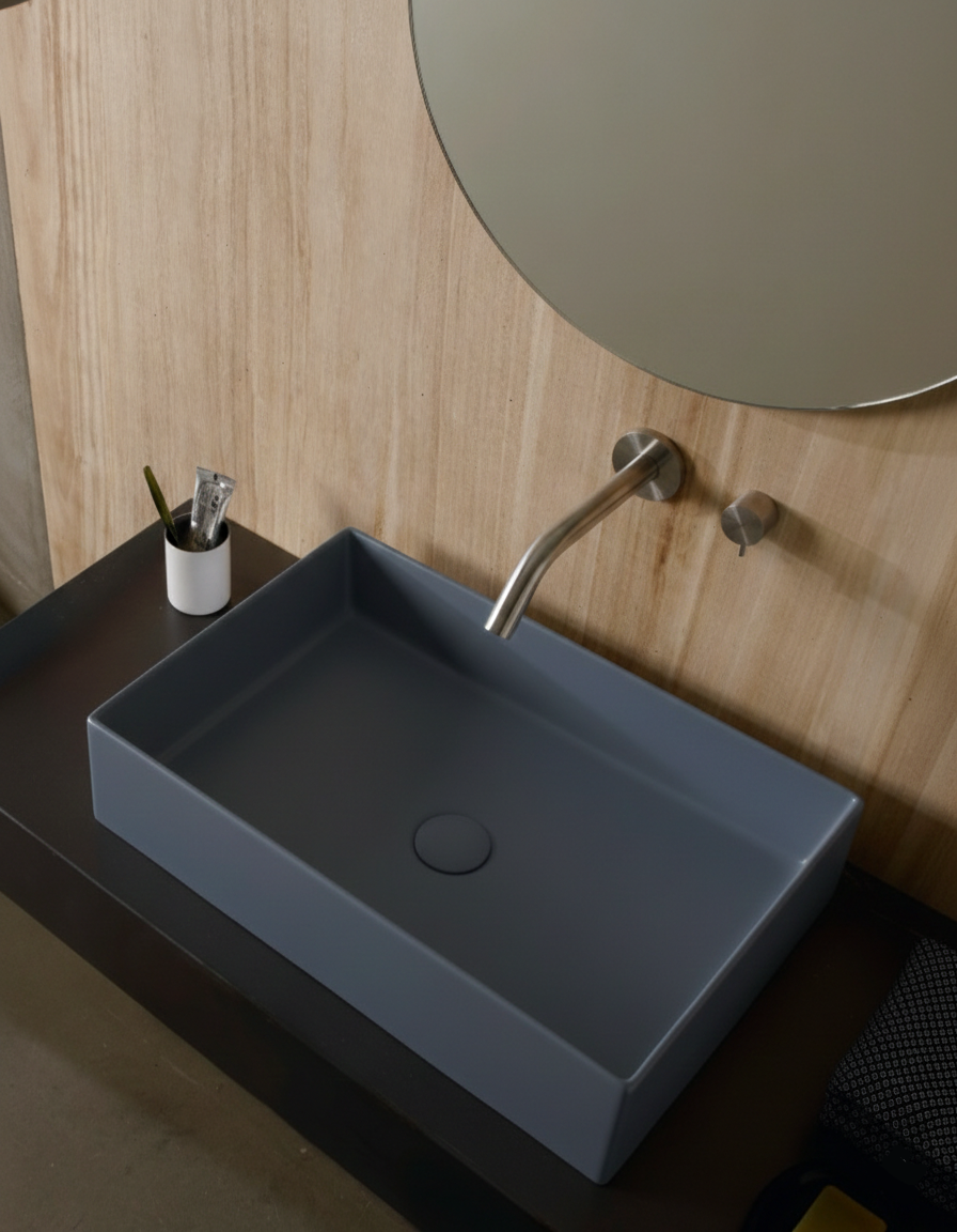 Lavoarul pe blat Scarabeo TEOREMA 2.0 cu finisaj glossy ocean reprezintă o soluție modernă și rafinată pentru spațiile sanitare contemporane. Designul său rectangular cu margini ultra-subțiri și dimensiuni de 600x400x140 mm oferă un aspect minimalist, maximizând în același timp volumul util al cuvei. Ceramica sanitară cu finisaj lucios reflectă lumina într-un mod armonios, adăugând profunzime vizuală și facilitând curățarea suprafeței.