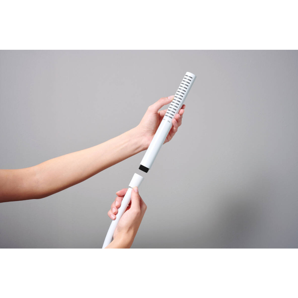 Para de duş manual Hansgrohe Pulsify 105 1jet Matt White este conceput pentru utilizare zilnică în instalaţii de duş, oferind un jet moale şi uniform datorită pulverizării PowderRain. Diametrul de 105 mm este ideal pentru cabine de duş compacte — jetul acoperă uniform corpul, creând o senzaţie de “învelire în apă”. Capul este realizat cu un disc pulverizator din plastic cu suprafaţă grafit, având duze din silicon rezistente la depunerile de calcar, ceea ce facilitează întreţinerea. Racordul este standard — G 1/2", DN15; presiunea minimă de funcţionare 1 bar, debit maxim la 3 bar aproximativ 6,0 l/min.