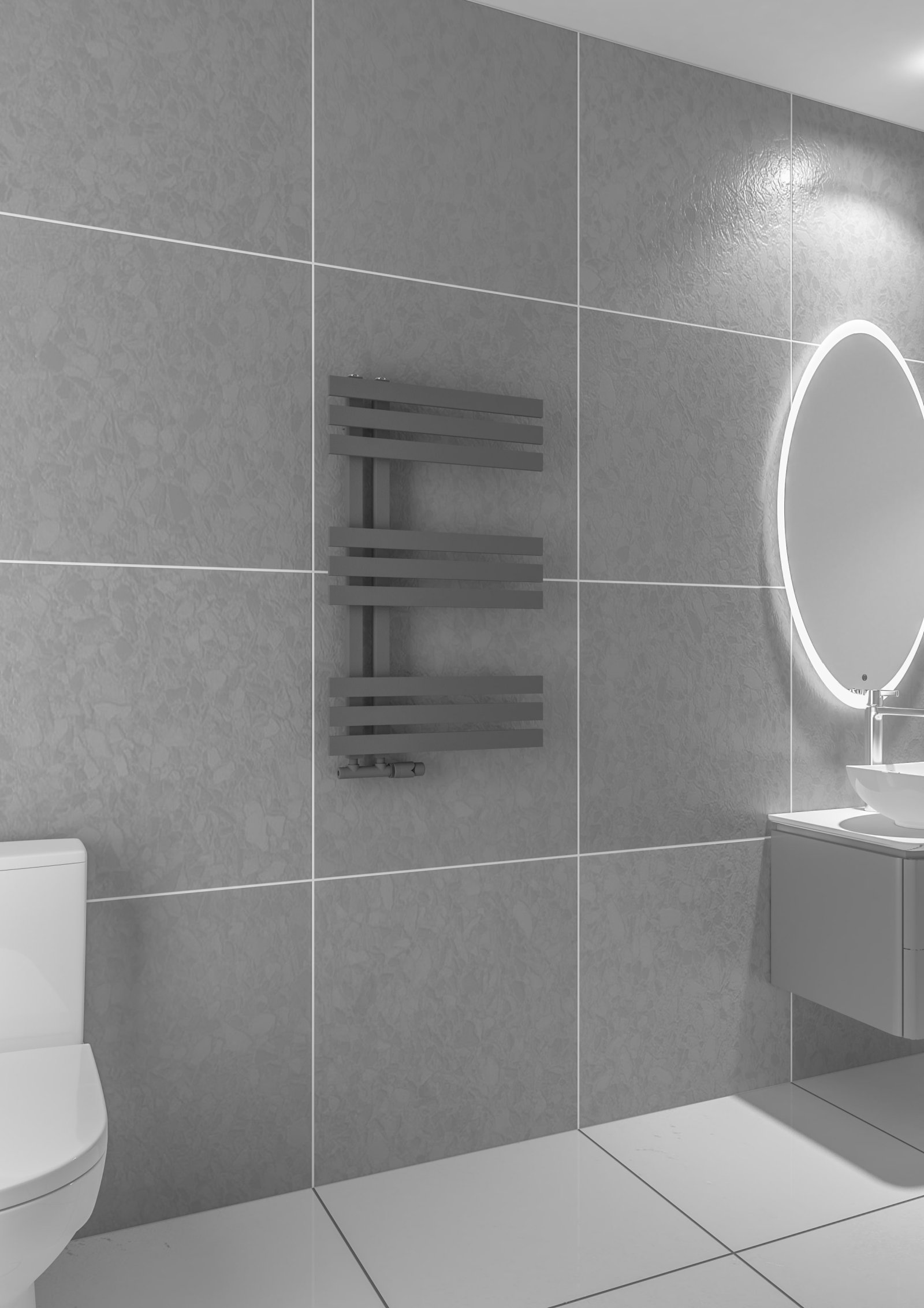 Radiator de baie din oțel, dimensiuni 500x800 mm, finisaj antracit. Se montează pe perete și oferă o încălzire eficientă a băii, fiind suficient de înalt pentru a distribui căldura pe verticală și a ajuta la uscarea prosoapelor. Modelul funcționează pe apă (agent termic) și poate fi echipat ulterior cu un TEN electric compatibil pentru a obține un model combinat (apă + electric).