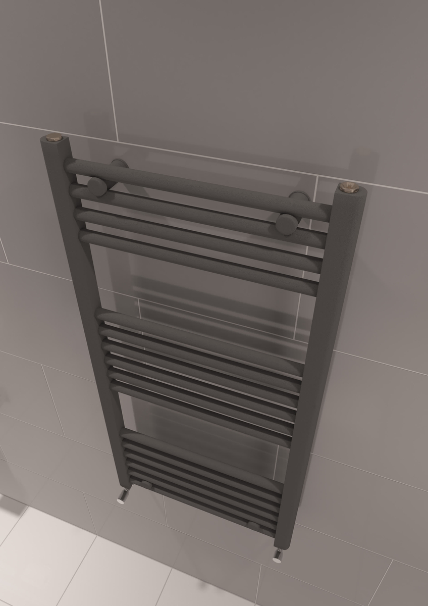 Radiator de baie din oțel, dimensiuni 500x1000 mm, finisaj antracit. Se montează pe perete și oferă o încălzire eficientă a băii, fiind suficient de înalt pentru a distribui căldura pe verticală și a ajuta la uscarea prosoapelor. Modelul funcționează pe apă (agent termic) și poate fi echipat ulterior cu un TEN electric compatibil pentru a obține un model combinat (apă + electric).