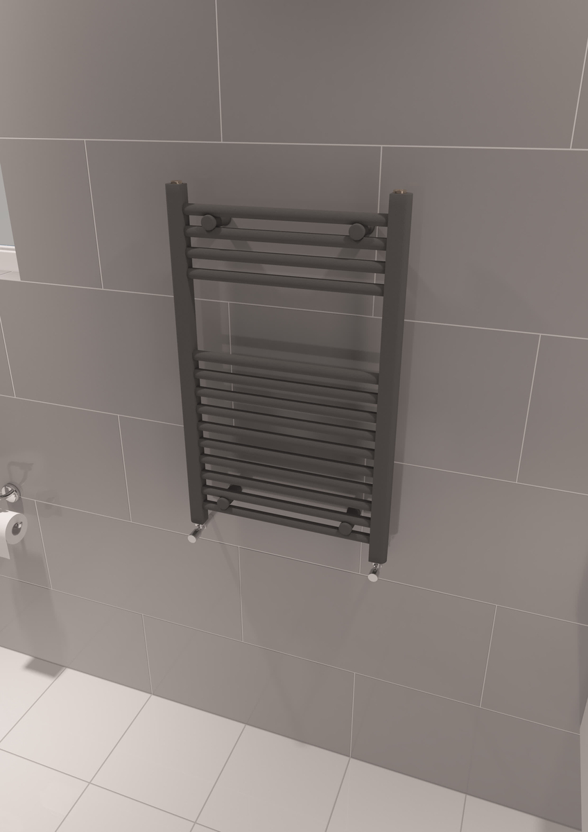 Radiator de baie din oțel, dimensiuni 500x800 mm, finisaj antracit. Se montează pe perete și oferă o încălzire eficientă a băii, fiind suficient de înalt pentru a distribui căldura pe verticală și a ajuta la uscarea prosoapelor. Modelul funcționează pe apă (agent termic) și poate fi echipat ulterior cu un TEN electric compatibil pentru a obține un model combinat (apă + electric).