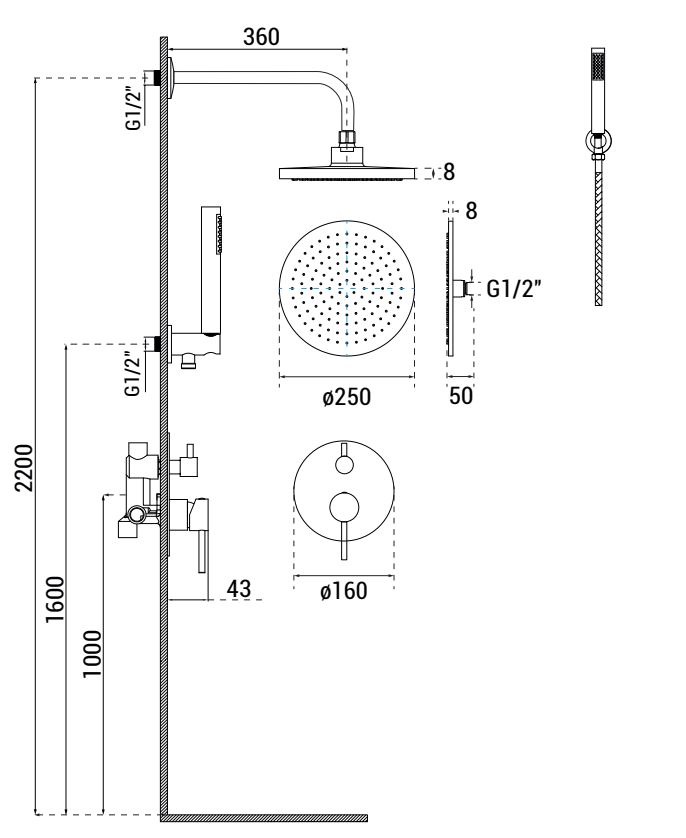 - Cap de duș Ø200 mm cu unghi reglabil și bară de 360 mm pentru confort optim.