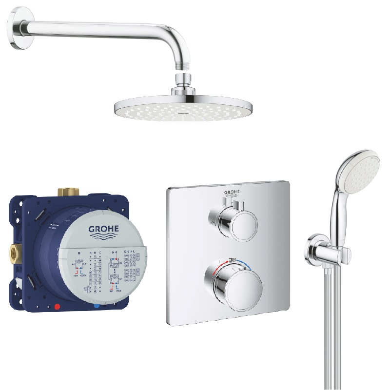 Sistemul de duș Grohtherm Tempesta Cosmopolitan este conceput pentru a asigura o experiență confortabilă și sigură la duș. Sistemul include un robinet termostatic încorporat, cap de duș superior cu diametrul de 200 mm, duș manual cu diametrul de 100 mm și două tipuri de jet, suport de duș de 286 mm și furtun de 1,5 m. Montajul se realizează ascuns, fără prelungitor pentru cadă.