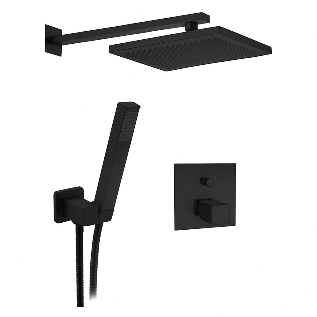 Setul de duș include un cap de duș dreptunghiular cu efect de ploaie, realizat integral din alamă, cu suport de 30 cm. De asemenea, conține un duș de mână din alamă cromată, un suport rotativ pătrat de perete din alamă cromată pentru montaj încastrat, prevăzut cu conexiune conică pentru furtun, precum și un mixer încastrat cu comutator.