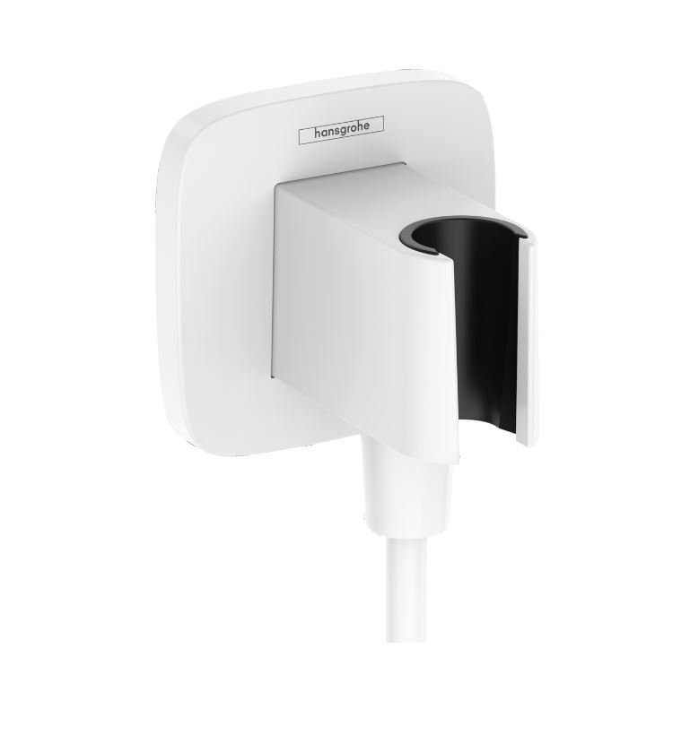 Conexiunea de perete cu suport pentru duș Hansgrohe FixFit Q, alb mat asigură alimentarea cu apă și fixarea manuală a capului de duș într-un sistem de duș. Realizat din plastic dur cu canal intern pentru apă, acesta facilitează montajul și reduce riscul coroziunii. Suportul integrat fixează capul de duș într-o poziție stabilă, oferind acces convenabil și un aspect ordonat al zonei de duș. Supapa de sens unic încorporată previne refluxul apei în sistem.