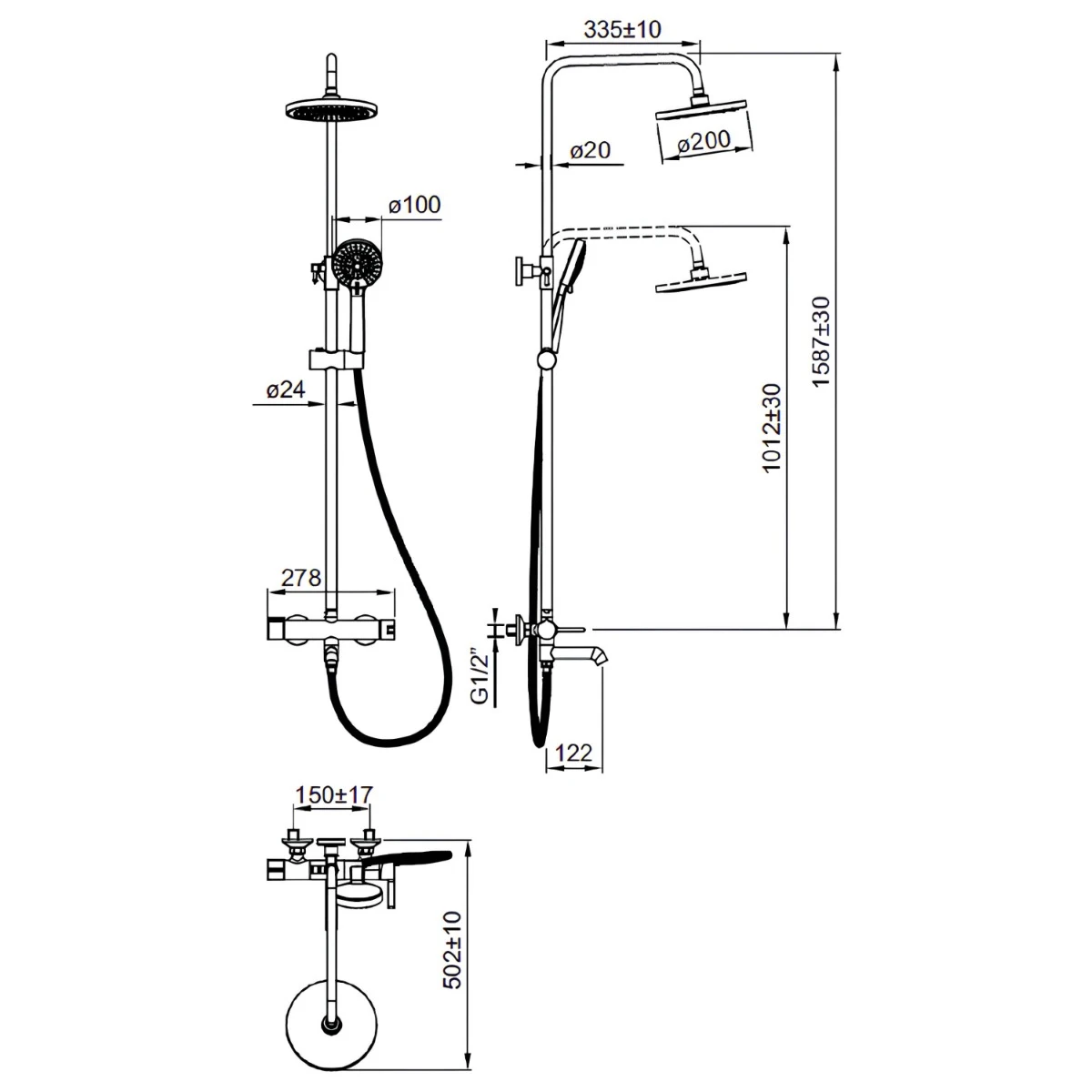 - Cap de duș rotund Ø 200 mm, pivotant pentru unghi optim de pulverizare.