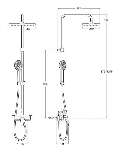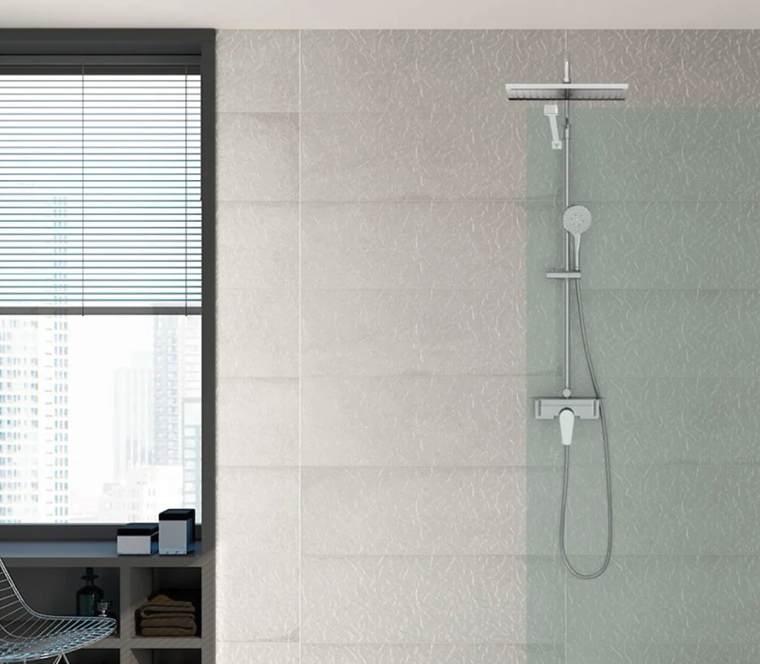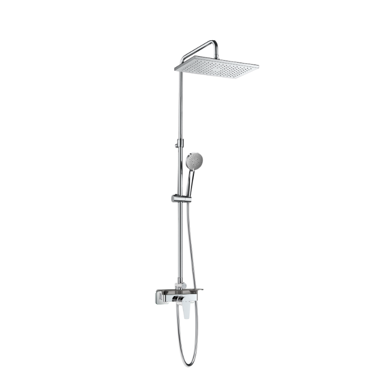 - Duș superior 360 × 240 mm cu braț pivotant, ce asigură distribuția uniformă a apei.