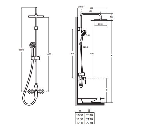 Condiții de montaj: instalare pe perete, presiune minimă necesară 1 bar. Dimensiuni sistem: 562 × 1165 mm.