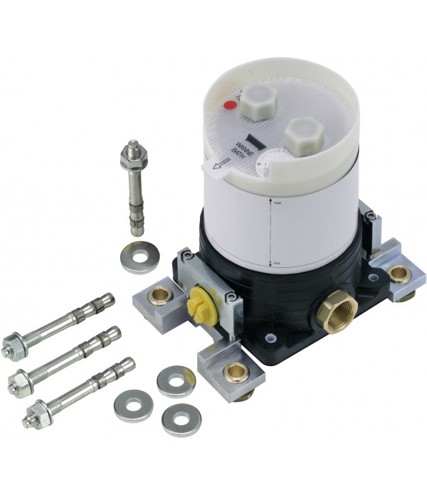 Corpul încastrat pentru baterie de podea Hansgrohe PURAVIDA este un component esențial, invizibil, care se montează sub pardoseală și care permite instalarea bateriilor de cadă autoportante din seria PuraVida.