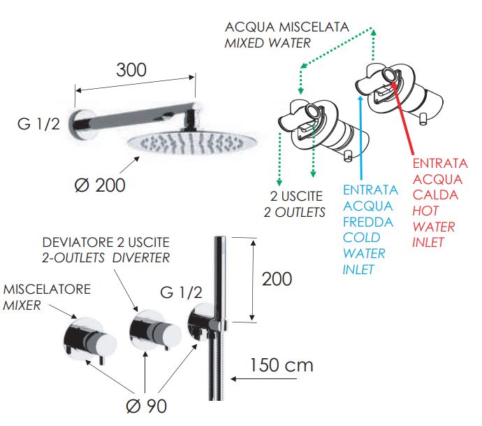 Setul de duș Daniel Rubinetterie Tokyo Chrome combină minimalismul modern cu funcționalitatea. Modelul este destinat montajului pe perete și include un duș fix ultra-subțire de 20 cm diametru, baterie încastrată pe placă, comutator cu două poziții, para de duș manuală cu o funcție, suport de perete de 30 cm și furtun flexibil de 150 cm. Carcasa și componentele sunt fabricate din alamă cu finisaj cromat, asigurând durabilitate și rezistență la coroziune.